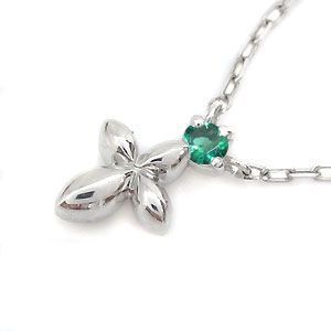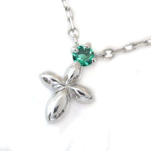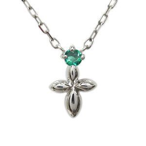 5月誕生石エメラルドを一粒使用した、プラチナ製のクロス(十字架)モチーフプチネックレスです。