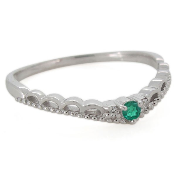 5月誕生石エメラルドを使用した18金製の、レースモチーフのV字デザイン華奢リング(指輪)です。