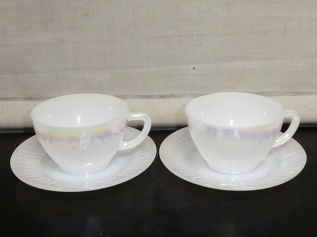 ●●FEDERAL フェデラル社製 ミルクガラス オーロラガラス ペア 2客 3枚ソーサー付き カップ&ソーサー●●