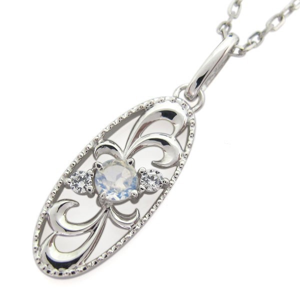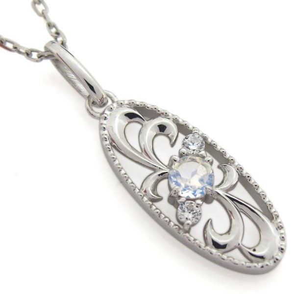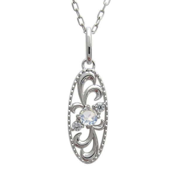 6月誕生石ロイヤルブルームーンストーンを使用したプラチナ製の、唐草(アラベスク)モチーフのネックレスペンダントです。