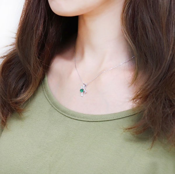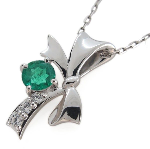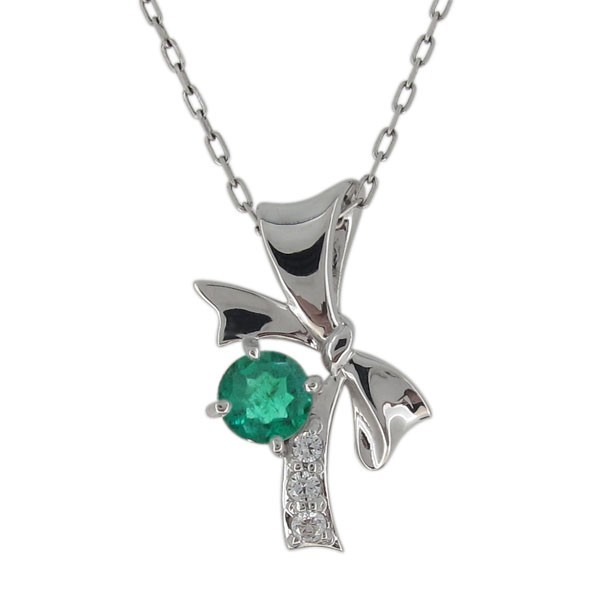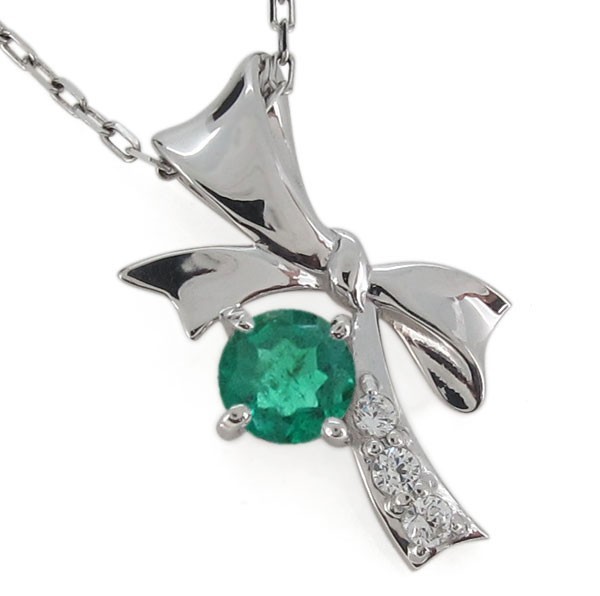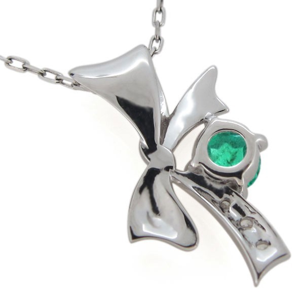 5月誕生石エメラルドを使用したプラチナ製の、リボンモチーフのネックレスペンダントです。