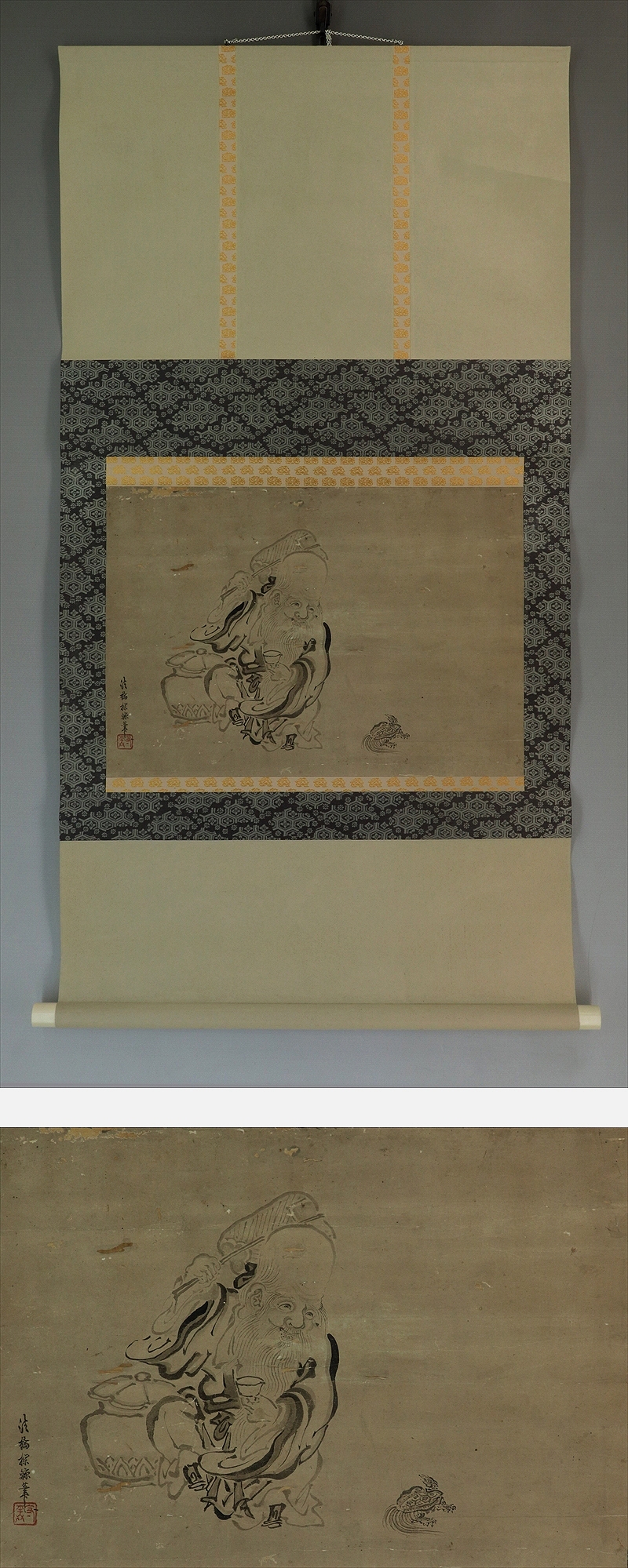 鶴沢探鯨 つるさわ-たんげい (?-1769) 江戸時代中期の画家。狩野(かのう)派鶴沢家2代。 父鶴沢探山の跡をつぎ,禁裏御用絵師をつとめた。法眼(ほうげん)。 明和6年8月21日死去。享年八十余歳。名は守美。作品に旧明眼院障壁画。 本紙は、染み、汚れ、強い折れと皺多い、擦れ、虫食、破れ、ヤケがあります。 表装は、染み、汚れ、折れ、皺、くすみがあります。 【サイズ】 作品 横約50cm×縦約35cm 表装 横約61cm×縦約118cm |