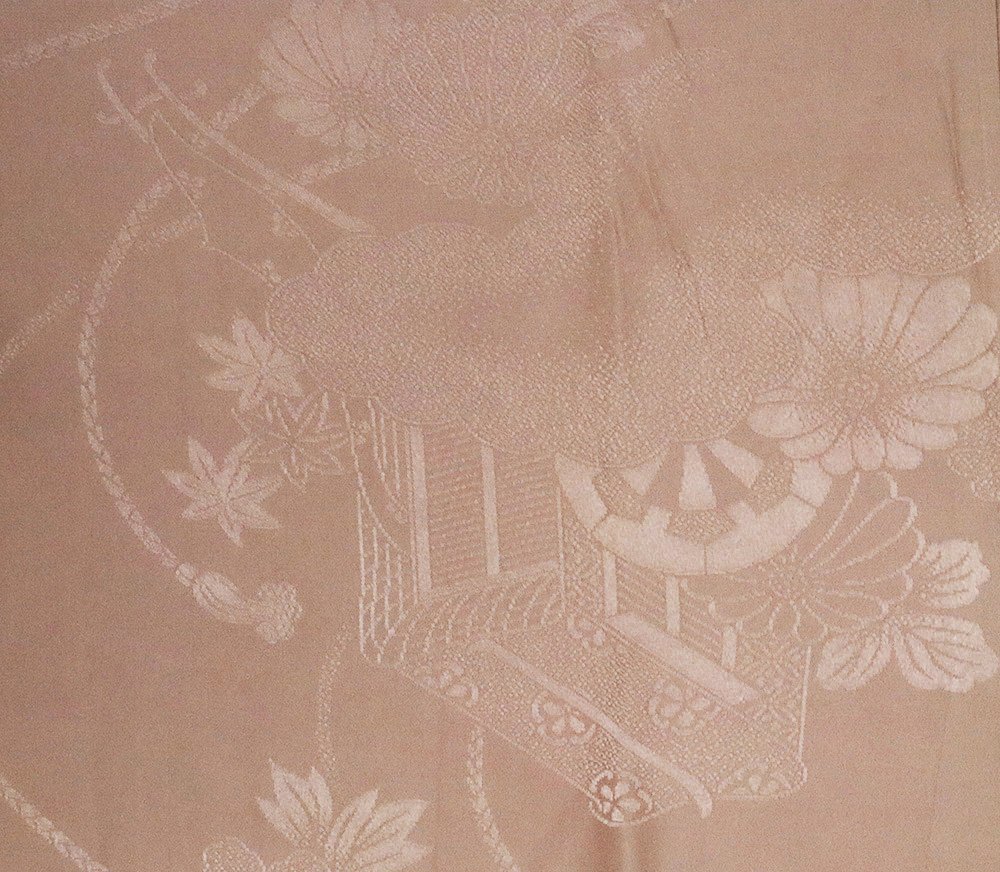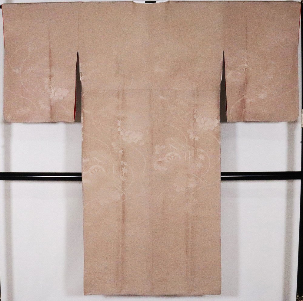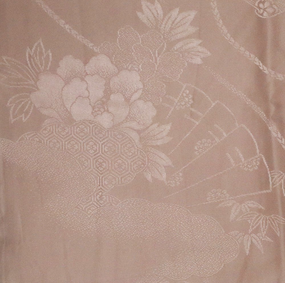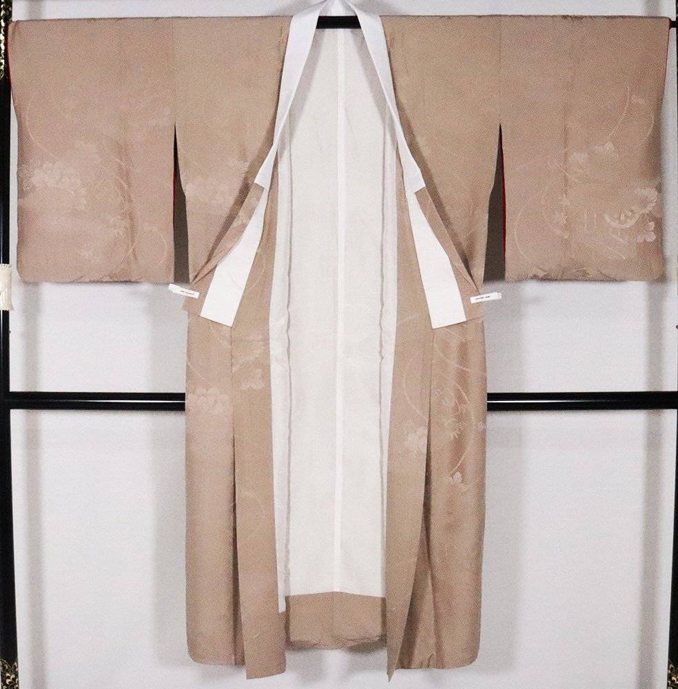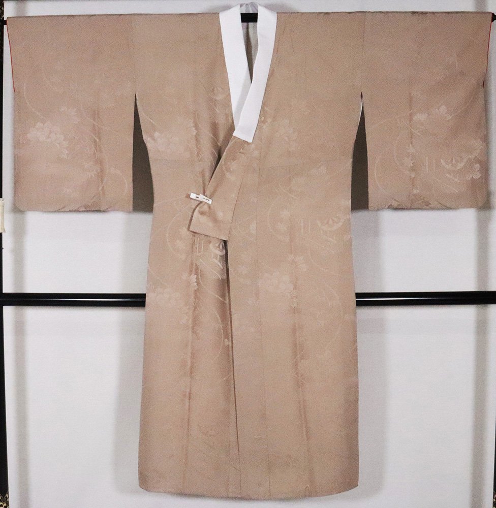 | 色・柄 | 高級長襦袢 袷 グレーかかった茶色地 牡丹・花扇子・御所車 (写真では上手く色が出ない場合があります。ご了承下さい) |