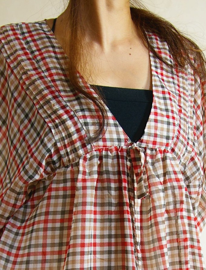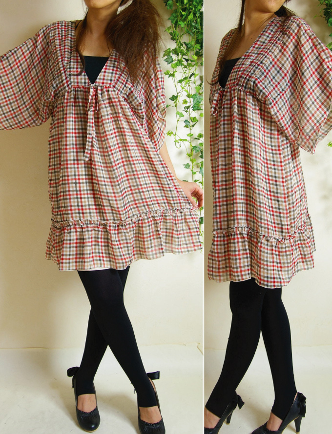 チェック シフォン チュニック ワンピース/M ベージュ 裏地付 新品