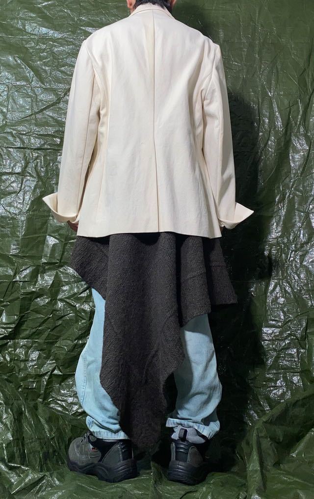アルパカ/ウール混紡のしっかりした素材感なので1枚で羽織るだけでも様になりますが一捻り加えてミッドレイヤーとしてさらに上にアウターを重ねると不思議なスタイリングが完成します。
