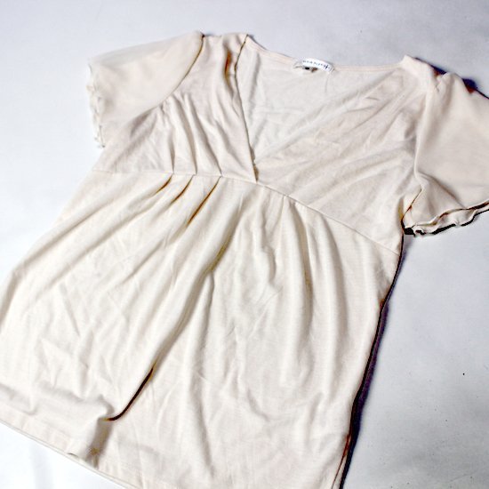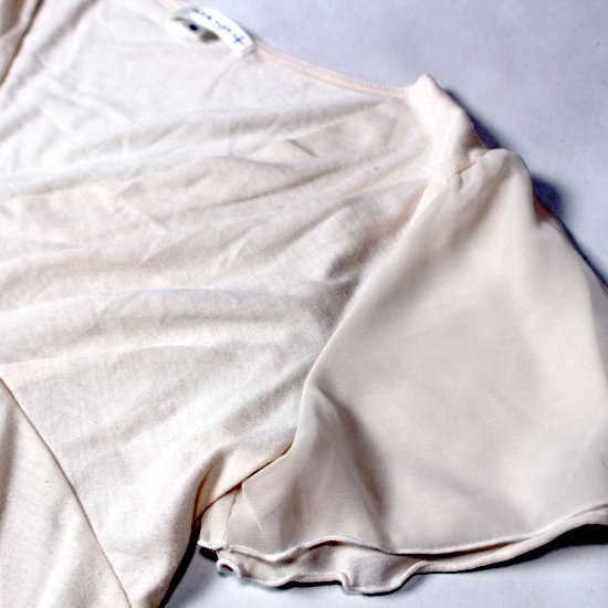 袖がシフォンの切り替えになった可愛いタックのストレッチカットソーです。