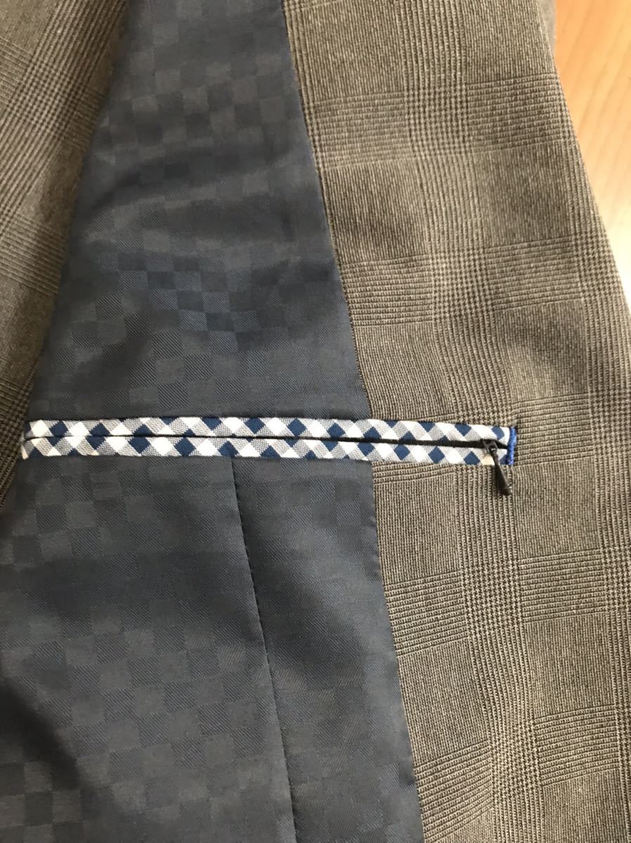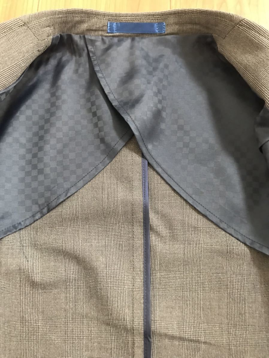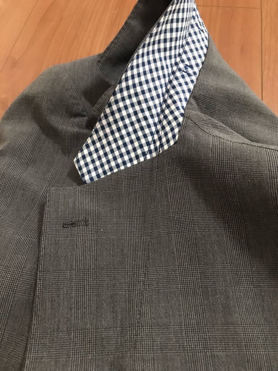 裏地にブルーのチェック柄、また内ポケットや襟裏にもブルーのギンガムチェックが施してあり、見えない部分のこだわりが非常にお洒落です。