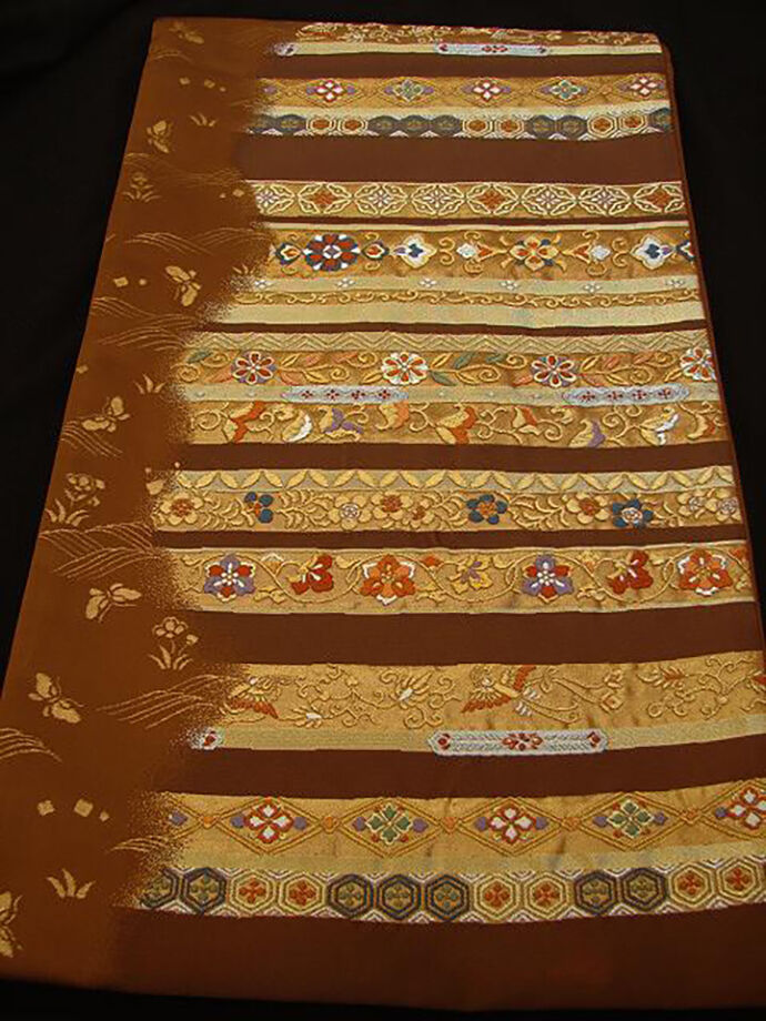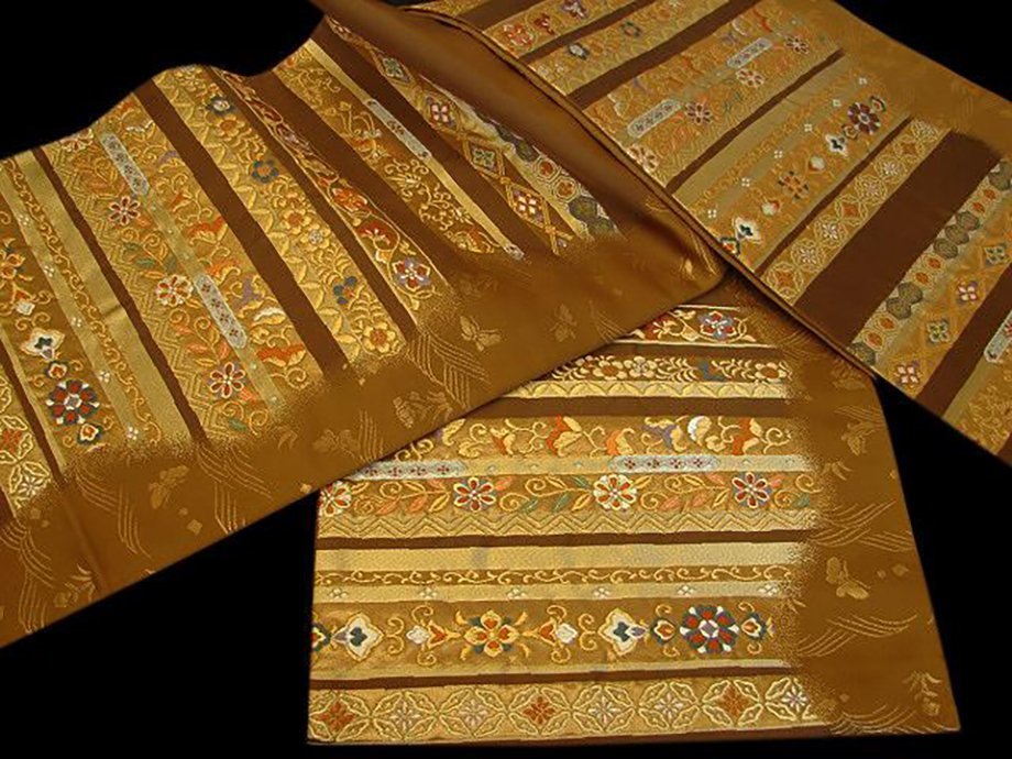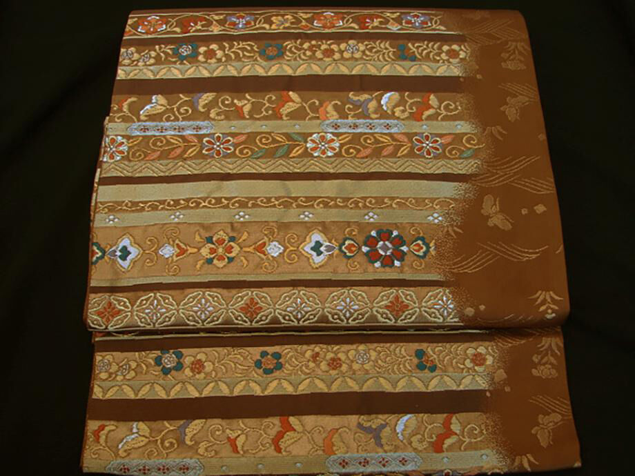 | 商品説明 | しなやかな手触りの重厚感溢れる西陣織の上質な袋帯。 茶色地に豪華な金糸等の横断に華文や亀甲、花菱等の織柄。 六通柄。 ※仕立て上がりのため証紙は解りませんが滑らかな裏地等から ブランドの帯と思われます。 |