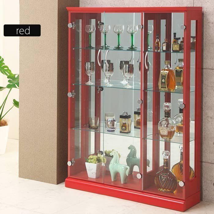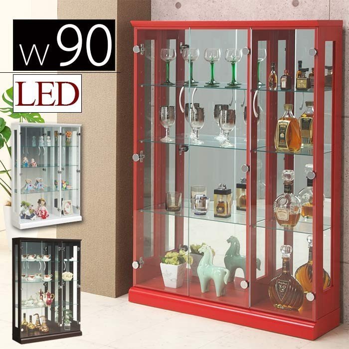 ショーケース コレクションケース 幅90cm LEDライト スリム 収納 フィギュアラック 木製 ガラス扉 レッド