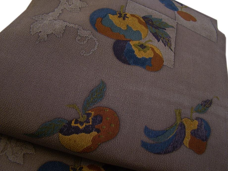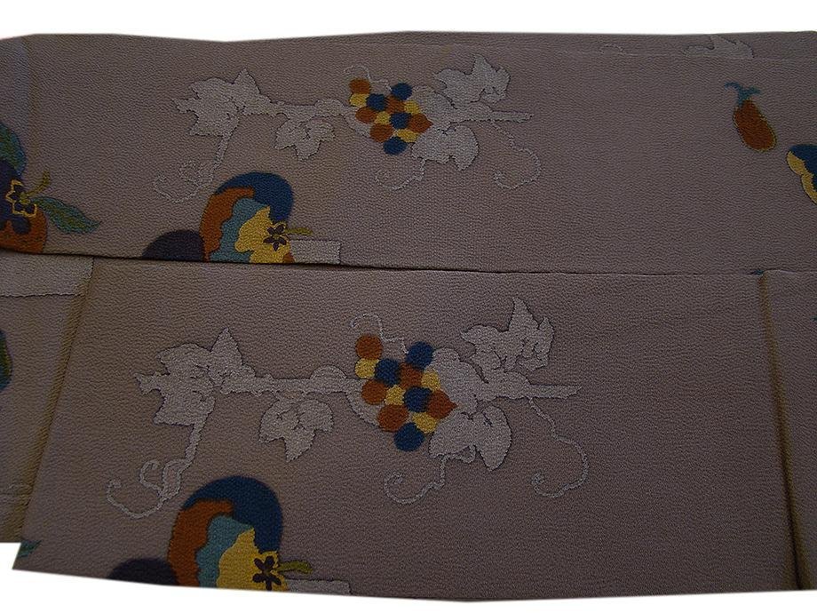 商品説明 | しなやかなぽってりとした上質な生地の手触り良いちりめんのなごや帯。 渋い紫鼠色地に藍、茶、黄土、滅紫色等の葡萄蔦や果実柄の染柄。 全通柄。 |