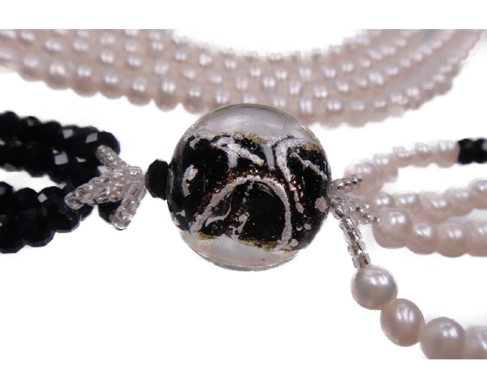 素材硝子と天然淡水真珠です。留め具の部分の材質はステンレスです 。真珠の照り非常に良い、淡水真珠特有の凹凸が若干ございます。