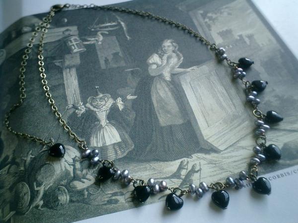小さな幸せ(?)着けるたびにそう思って頂けたら♪繊細でシックなオニキスと淡水パールのネックレスです♪淡水パールは3×5ミリ位のポテト型でやさしい表情です♪8ミリのオニキスのハートを合わせてシックで華やかな大人のネックレスです♪長さは全長55センチ位で調節自由です♪チョーカーー風にしてもブレスレットにしても可愛いです♪お揃いのブレスレットも出品しています。シンプルで飽きのこないいつまでも着けられるデザインを考えて作りました!ハンドメイドをご理解頂いてノークレーム、ノーリターンでお願いします