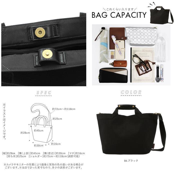 商品説明 | ・キャンバス生地の外側にはっ水加工を施した、機能的な2WAYトート&ショルダー(大)が新登場! ・メイン収納スペース内側は、中央のファスナーポケットを仕切りにして前後に区切られた3ルーム仕様。 ・中央の仕切りの前面のスペースは、A4サイズ書類がすっぽり入るサイズ感。仕切りの側面には、スマホやパスケースが収納できるオープンポケット×2を装備。 ・仕切りの反対側はボトルスペース付きなので、ランチボックスや水筒などが定位置にスッキリ収まる♪ ・中央のファスナーポケットには、長財布やキーケースなどの貴重品を収納するのに便利。 ・バッグ開口部は開閉がラクラクできるマグネットボタン仕様で、小物の出し入れもスムーズ。 ・ハンドルはスナップボタンでひとまとめにできる合皮カバーデザイン。汚れが付きにくく、握りやすいのがポイント! ・底マチが広く、どこに何があるか見やすくザクザク荷物が入れられる♪ |