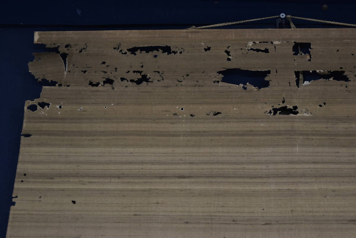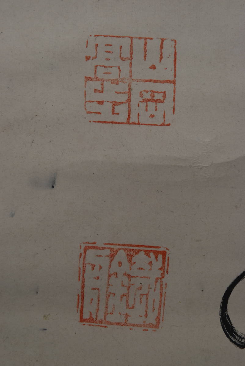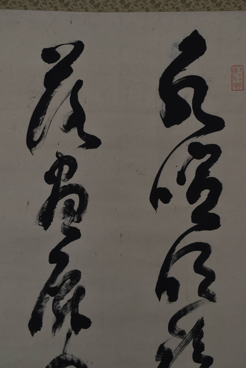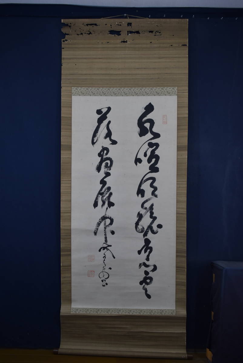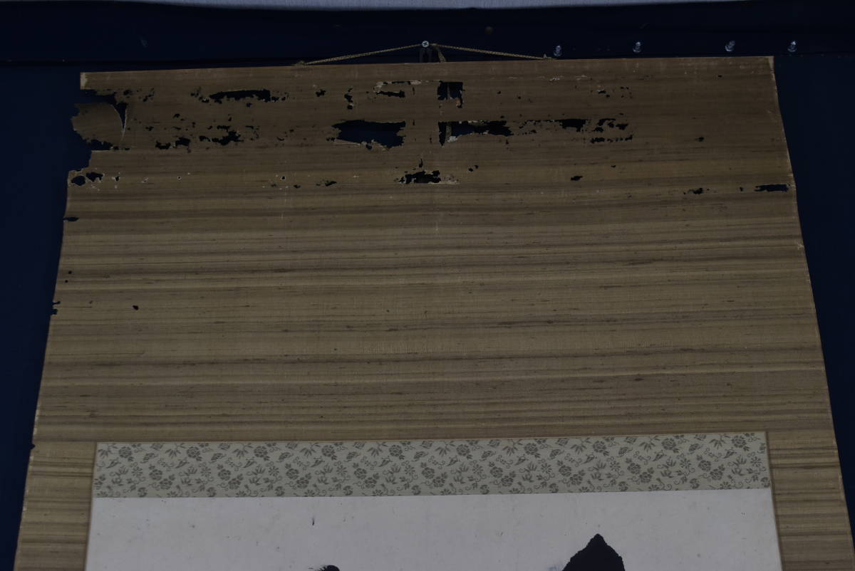 【作品状態】 本紙は本肉筆です。本紙は薄汚れ、全体に多少の汚れシミあります。表装は時代感あり、天に多数の虫穴、欠損あります。
