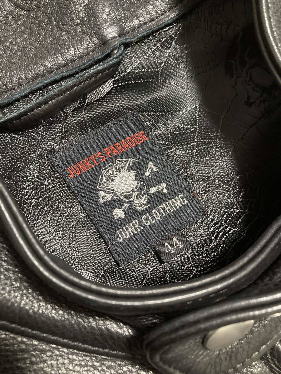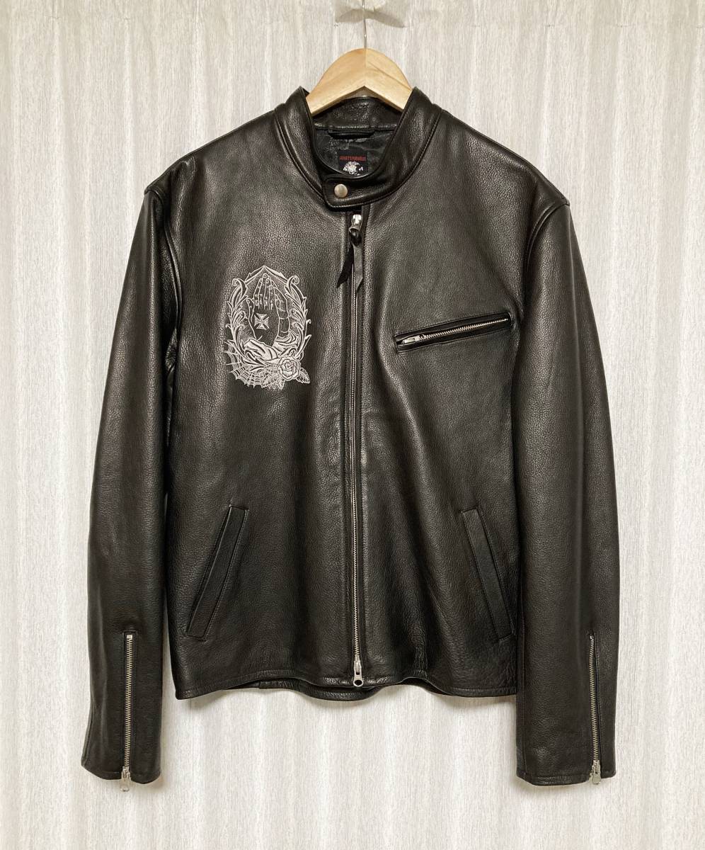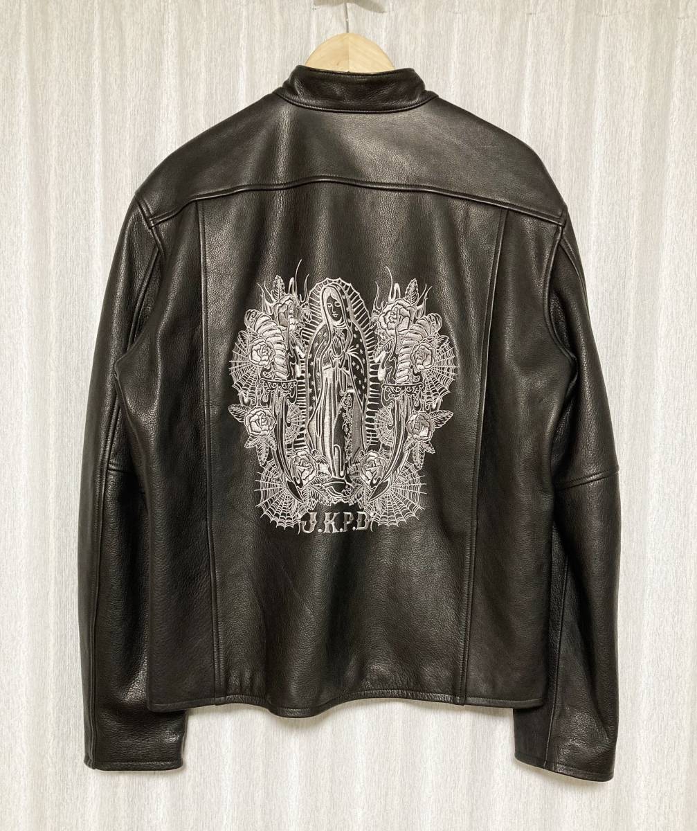 極美品☆[JUNKY'S PARADISE J.K.P.D×Y'2 LEATHER] 定価97,900 合唱マリア刺繍 シングルライダース レザージャケット 44 XL 牛革 ブラック