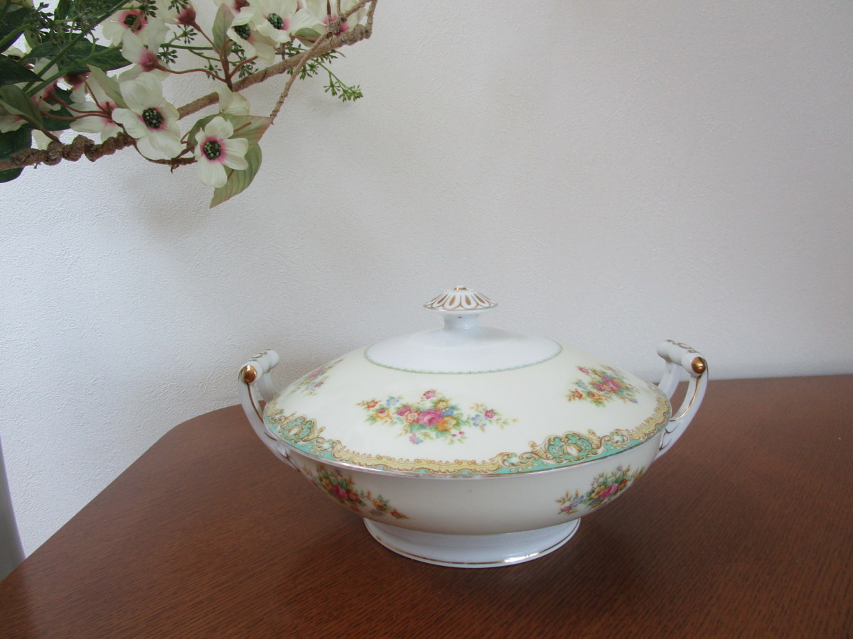spoto china japan 蓋付 持ち手付 皿 大皿 花柄 になります。 長期保管期間あり、底面に擦れ(色付き)、金色持ち手部分等剥げございます。 【サイズ】 口径 22.5cm 持ち手まで 28cm×高さ 7.5cm 蓋閉めた状態 15cm 状態も含めて写真にてご確認下さい。 | ||||