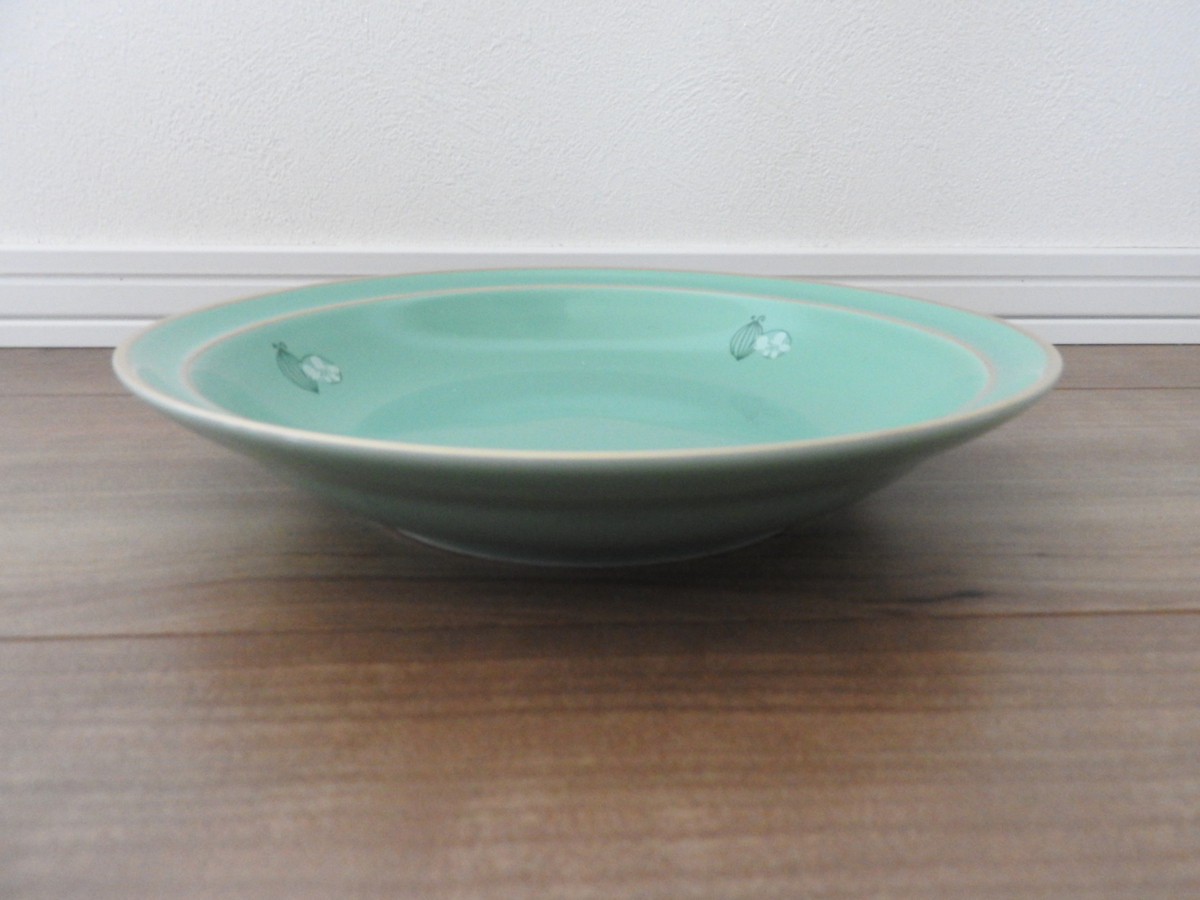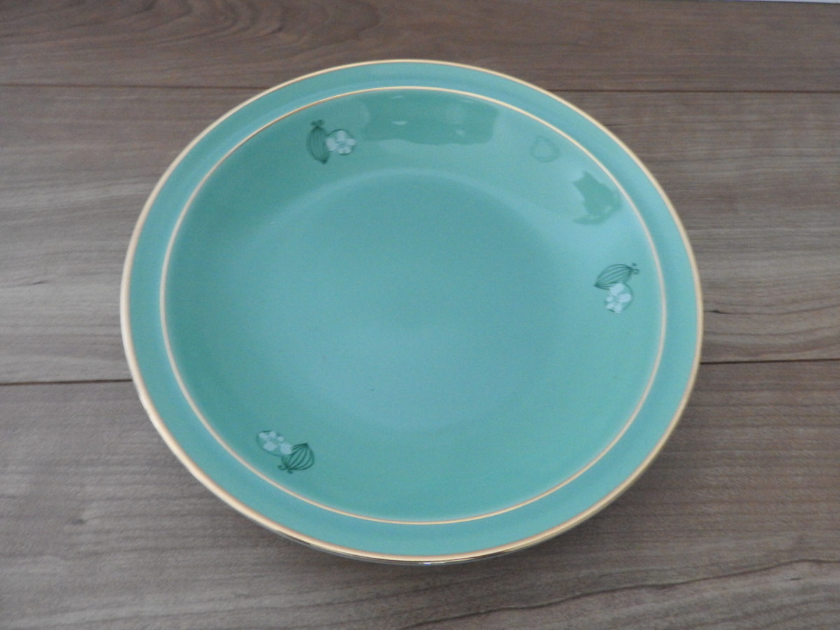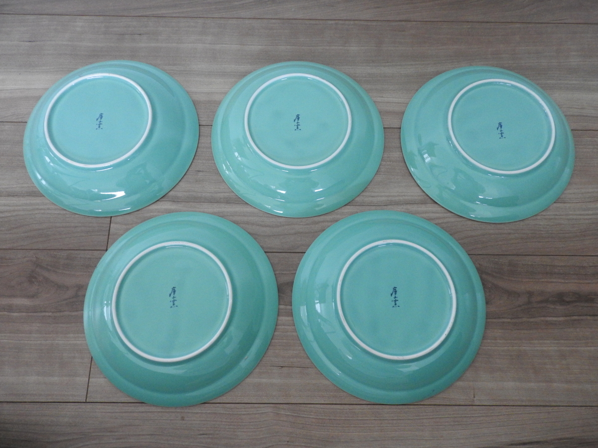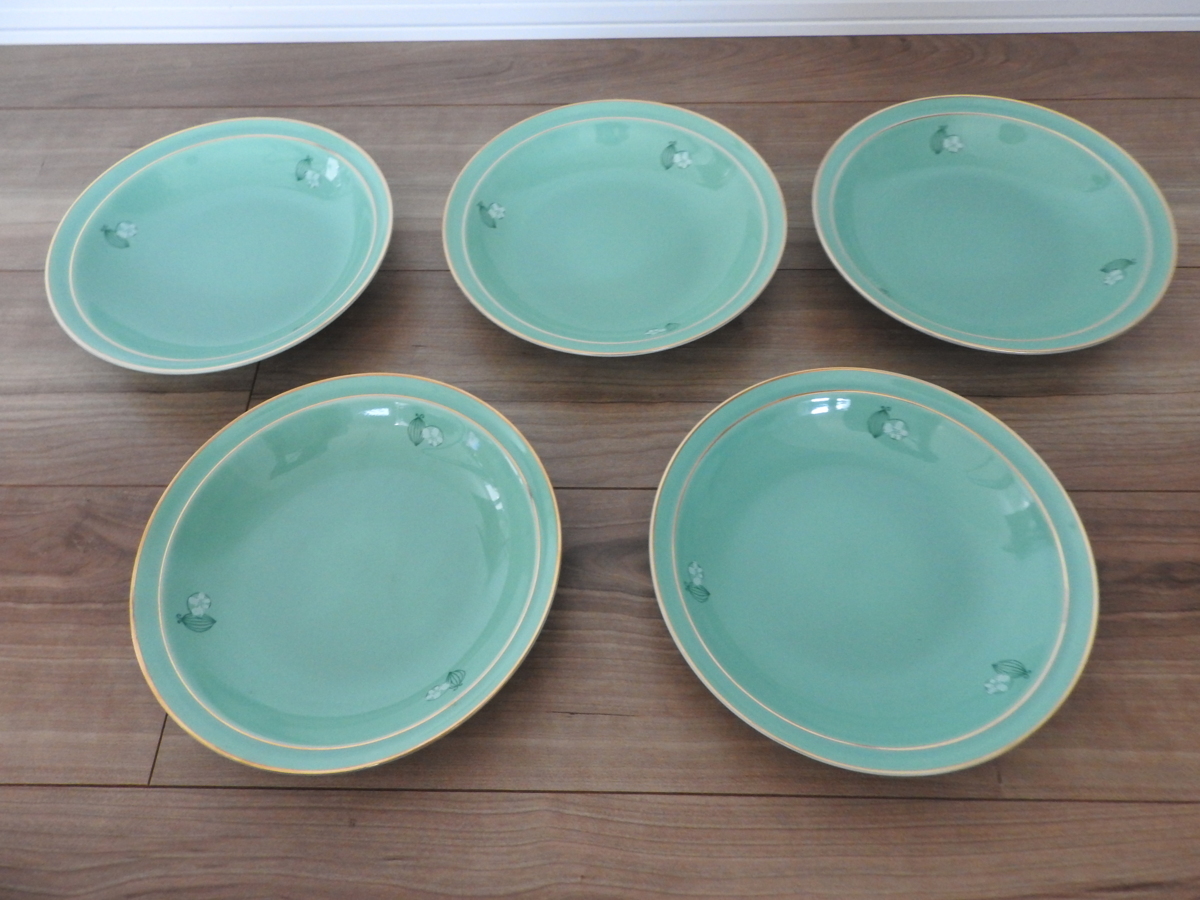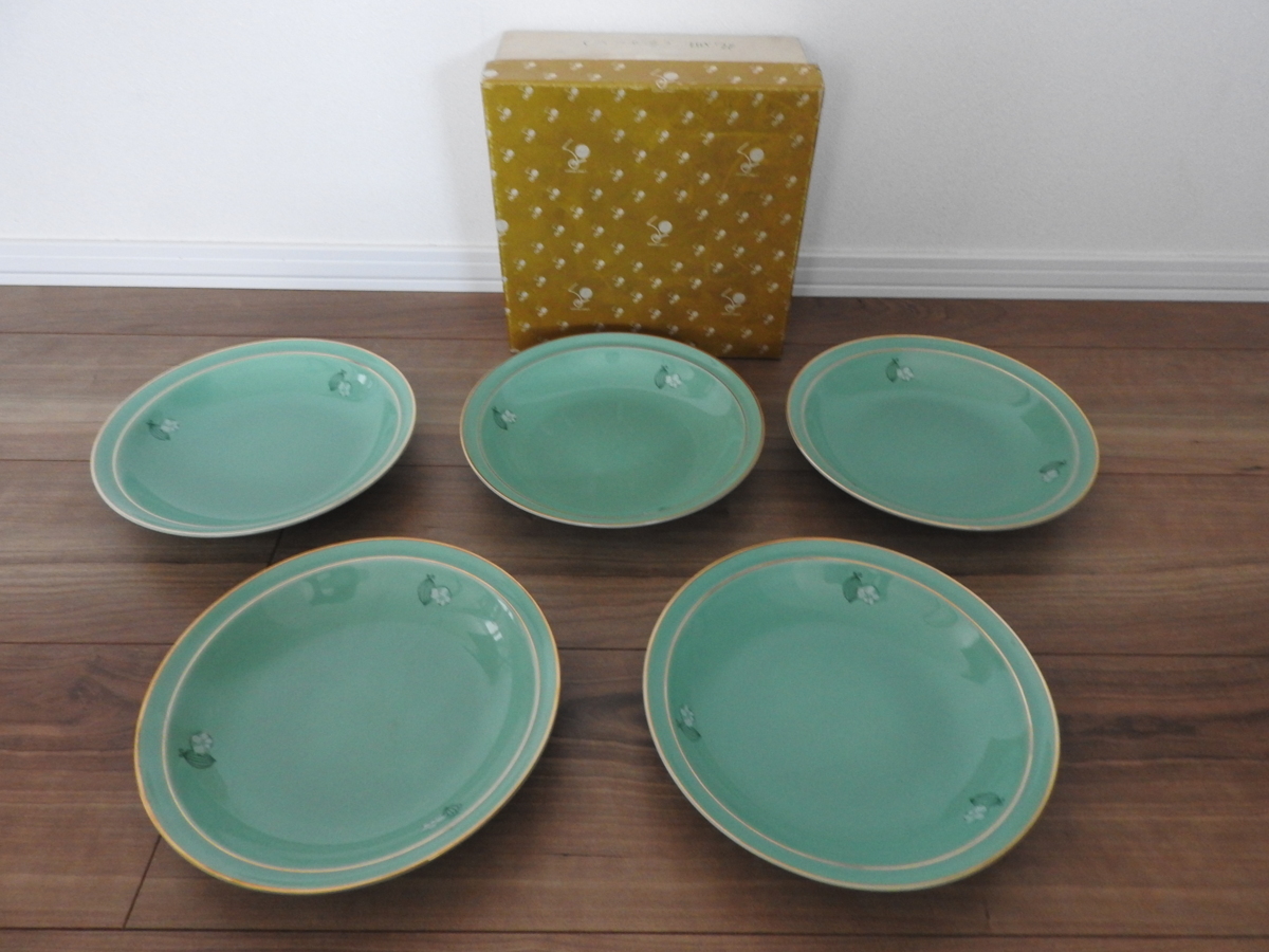 庫山窯 皿 5客 グリーン 花文金縁 浅鉢 になります。 保管期間ございますが、特に気になる傷等は見受けられない状態です。 【サイズ】 直径 19.5cm 高さ 3.5cm 写っているものが全てです。 状態も含めて写真にてご確認下さい。 | ||||