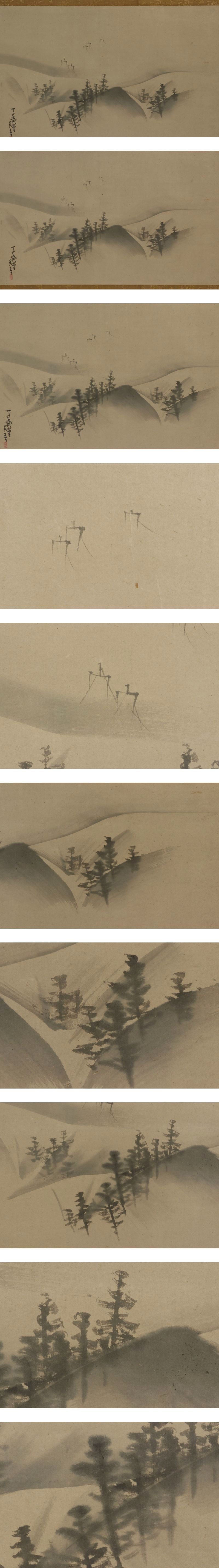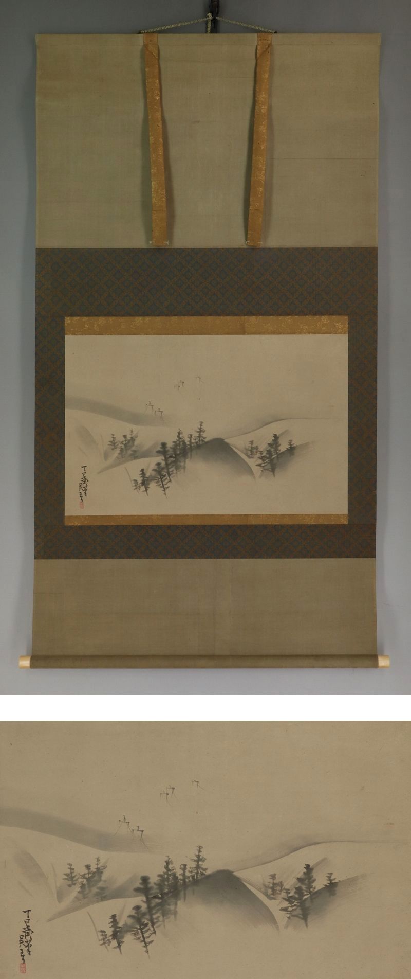 松村呉春 まつむら-ごしゅん(1752-1811) 画家。四条風の開祖。名豊昌・春・月渓、字伯望。称嘉右衛門・文蔵。 壮年の頃呉服村酒造家に寓し、呉春と改め大西酔月を師として、のち蕪村について 画を修め俳諧をよくする。蕪村の歿後は応挙の画を好み弟子にと請うが応挙は固く辞し、 親友として画学を研究し写生を勉強して終に一家をなす。 文化8年(1811)歿、60余才。 本紙は、染み、軽い折れ、軽い皺、虫食い痕、ヤケがあります。 表装は、染み、汚れ、折れ、軽い皺、ほつれ、ヤケ、虫食い、箱に傷みがあります。 【サイズ】 作品 横約55cm×縦約35cm 表装 横約66.5cm×縦約122cm |