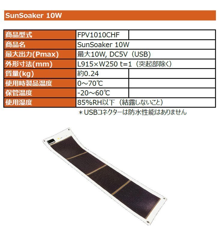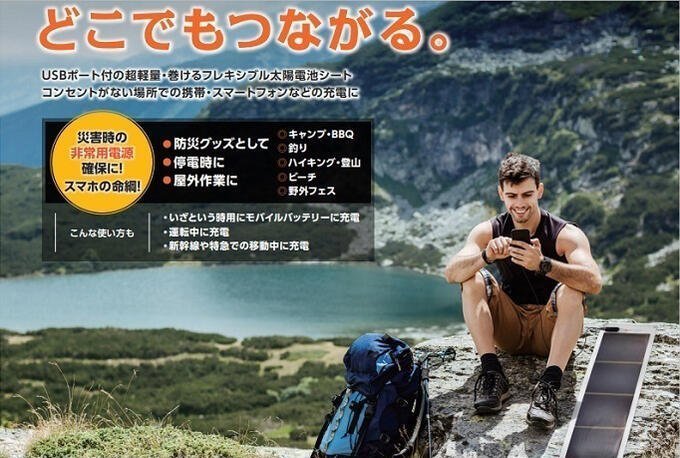 | 【 ここがポイント 】 ★F-WAVE・SUN SOAKER(サンソーカー)は、信頼のMADE in JAPAN。無限の太陽の恵みを最新技術でエレルギーとして生み出す商品です。 ★厚み約1mm(USB端子部分除く)で、本体重量:約240gと超軽量で高耐久。だから巻いてラクラク持ち運びが可能です。 ★スマホ、カメラ、バッテリーやその他のデバイスが太陽光だけで充電できます。(太陽光をエネルギーに変えて出力し、USBで接続可能な機器を充電します。USB端子から受電する機器に接続できるコードが別途必要です) ★コンパクトで持ち運びに便利!電源供給源のないアウトドアシーンや、震災時の長期停電時、連絡や情報入手に大事なスマホの充電に大活躍!! ★ハトメ加工した穴を利用して吊り下げたり、置いたりして太陽光が効率よく当たる様セットして使用します。