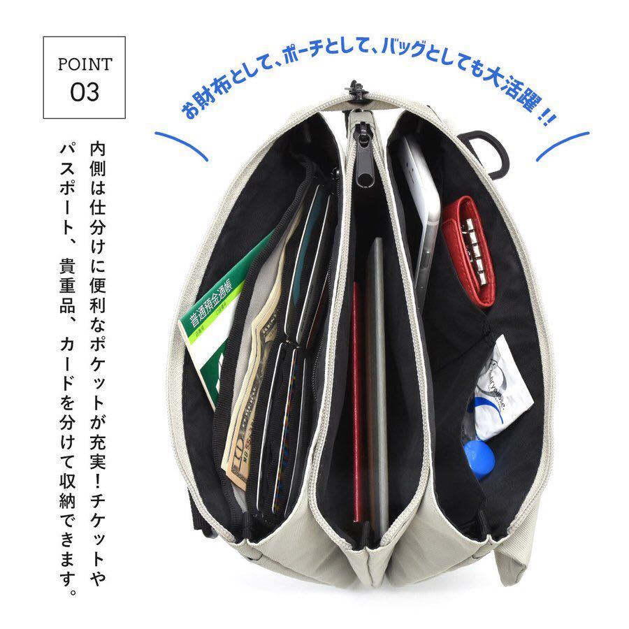 パスポートや航空券、貴重品、カードを分けて収納でき、このバッグひとつでおでかけ可能!