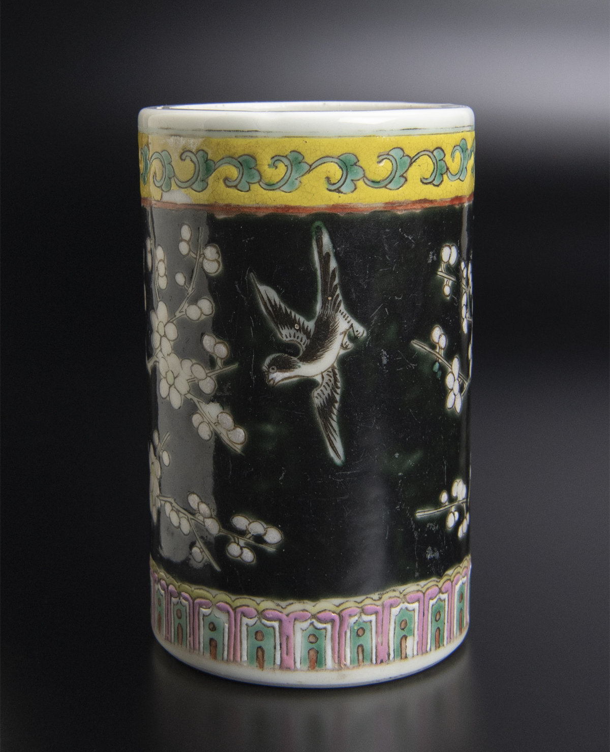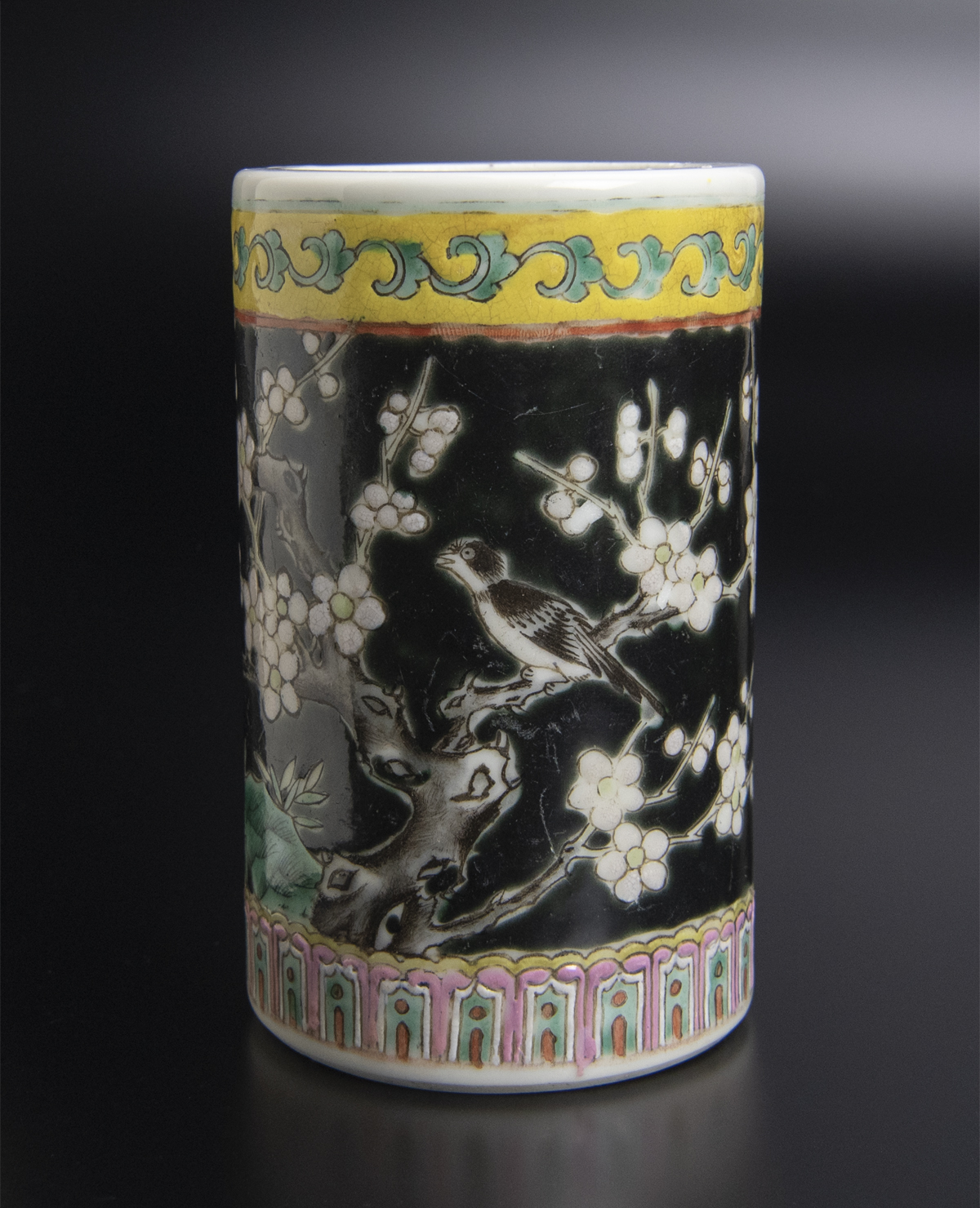 清 墨地五彩花鳥紋筆筒 大清乾隆年制款 中国 古美術