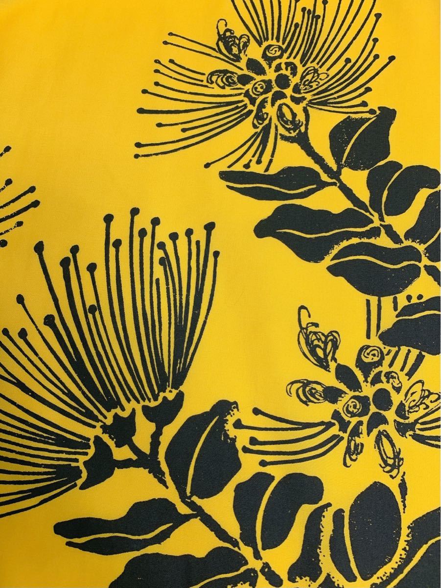 明るくて元気の出るイエローにブラックでレフア柄です。