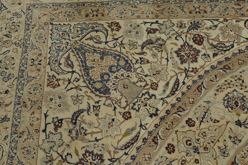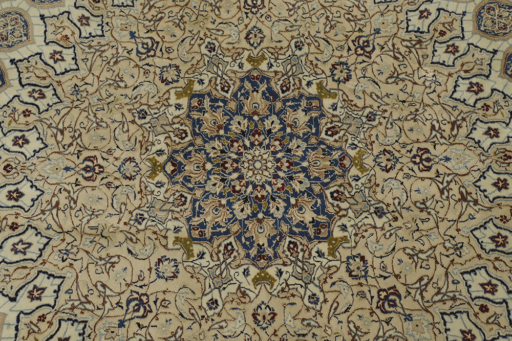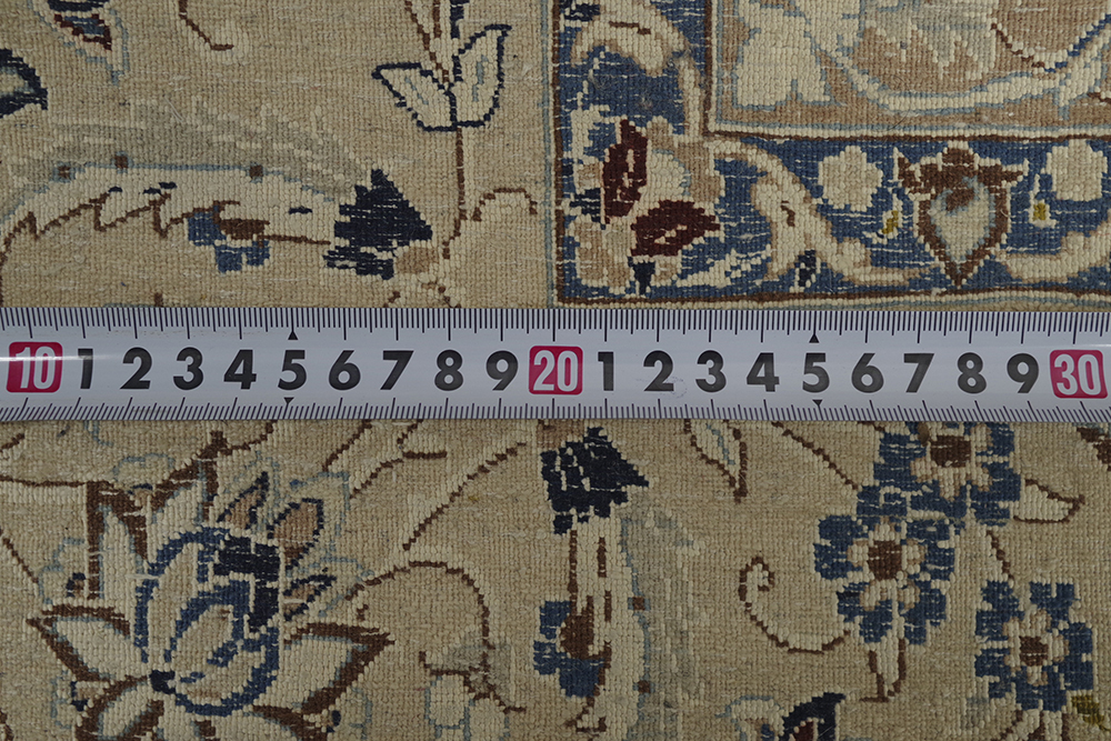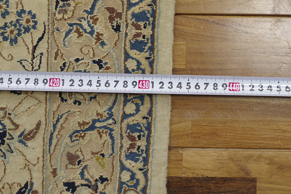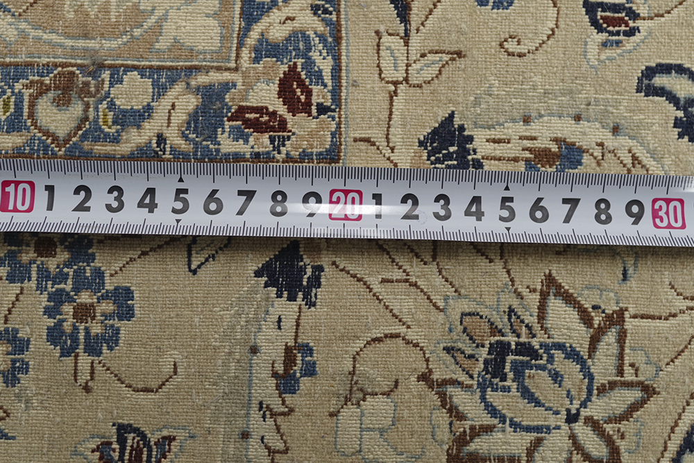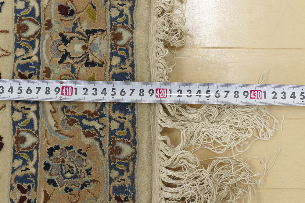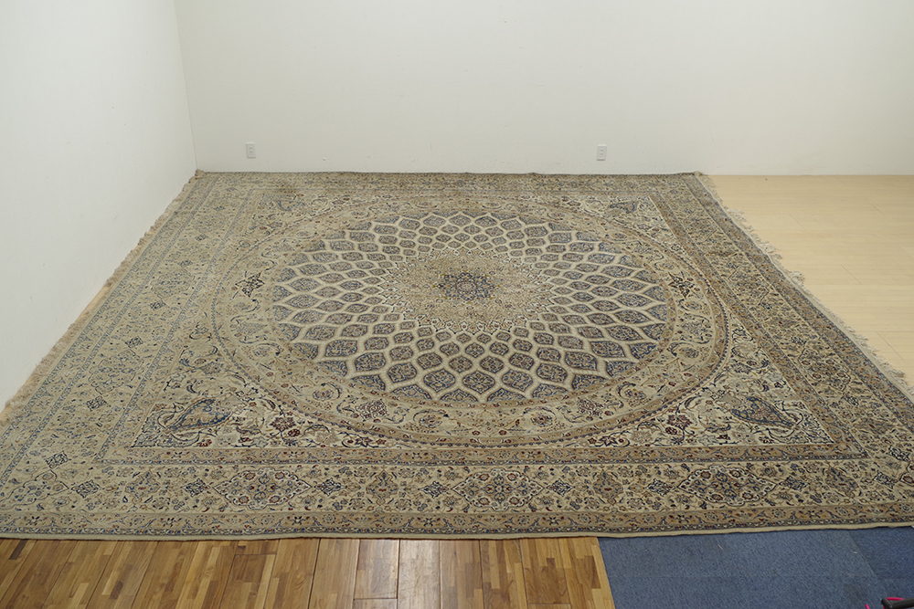ご覧いただきありがとうございます。 イラン、ナイン産のペルシャ絨毯のご紹介です。 418cm×435cmの大判サイズ伝統的なメダリオン柄の絨毯 2辺共に4mを超えるサイズはなかなかお目にかかることのないのではないでしょうか。 経年、使用に伴い、一部タバコを落としたような跡がございますが、気になるような匂いは感じませんでした。 掃除機を当てるなど、簡単な清掃は行っておりますが、専門的なクリーニングは行っておりません 気になる方は、落札者様にてご手配ください。 表記サイズ(約) 418cm×435cm 実寸サイズは、写真にてご確認ください。 発送は岡山県よりらくらく家財便Dランクでお届けいたします。 ※折り畳まないと発送が難しいため、折りたたんだ状態での発送になります。 折ジワが発生するかと思いますが、予めご了承ください。 | ||