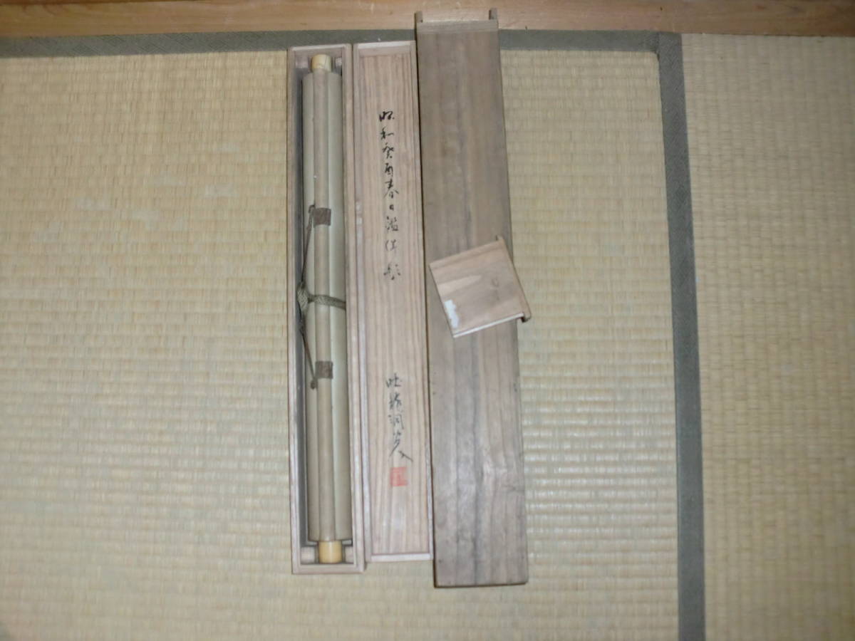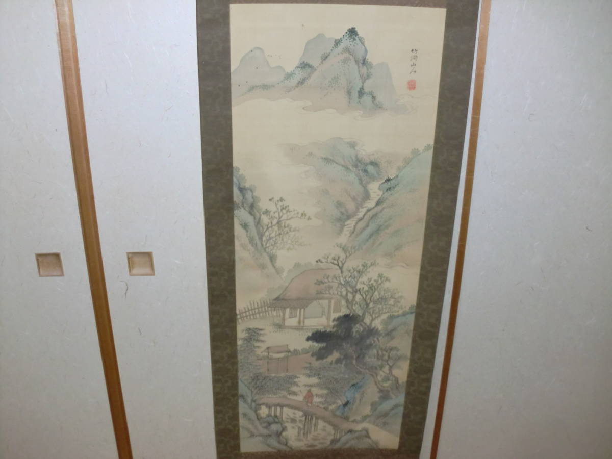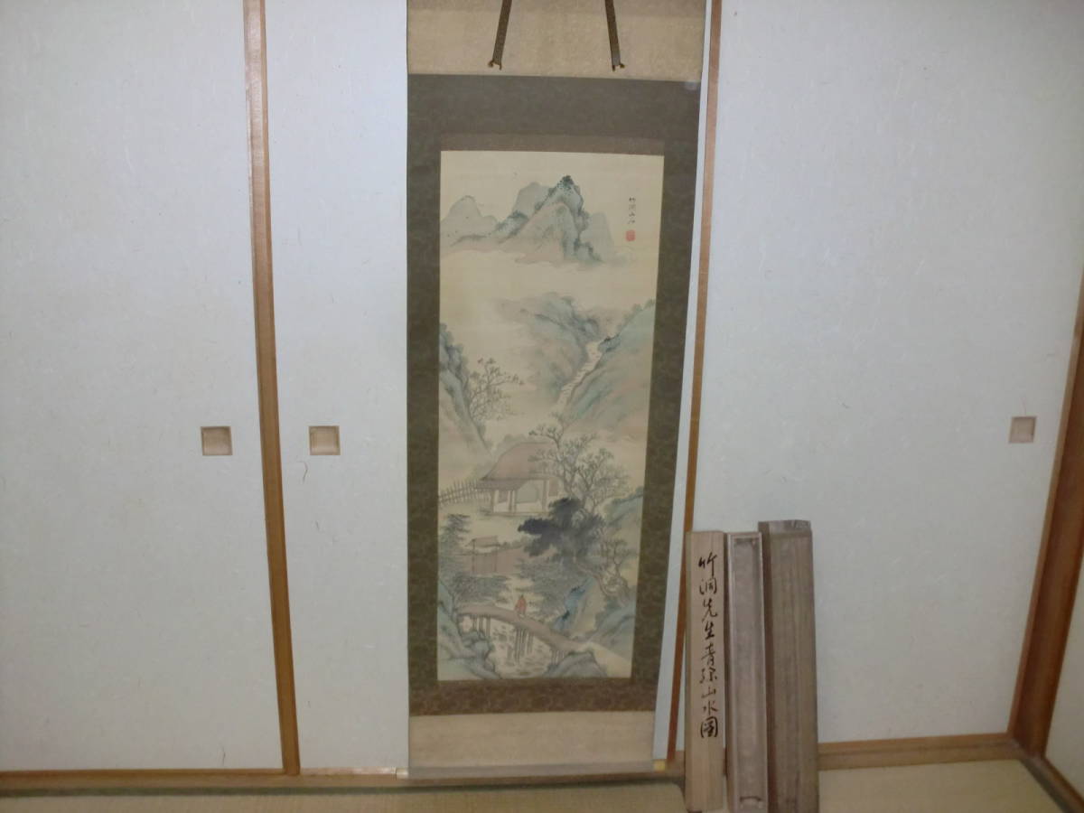 【模写】掛軸 文人画 中林竹洞 トテモ綺麗で洒落た青緑山水圖 絹本 極箱 二重箱