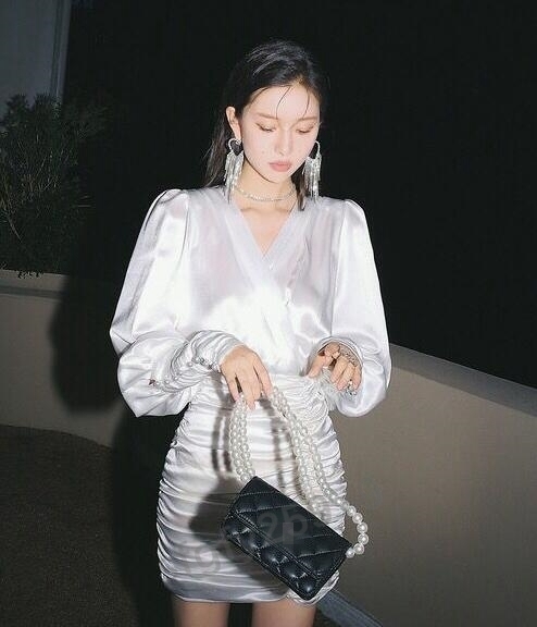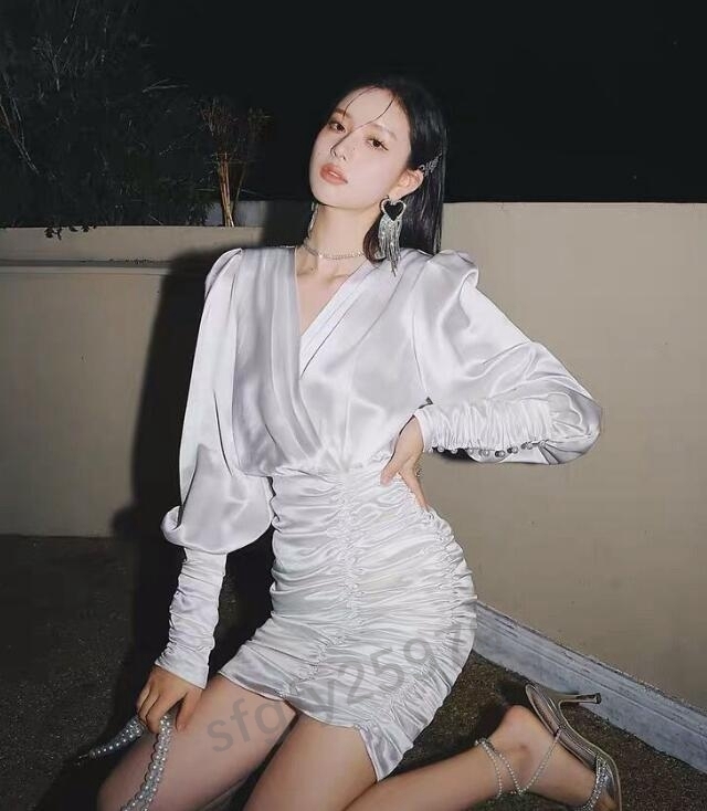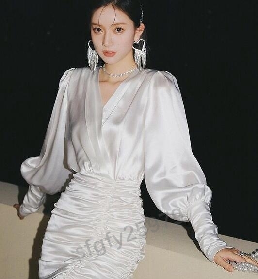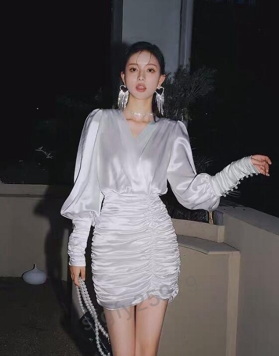 F962☆レディースワンピース OL通勤 上質 二次会ドレス 美胸 ミニ丈 長袖 つるつる