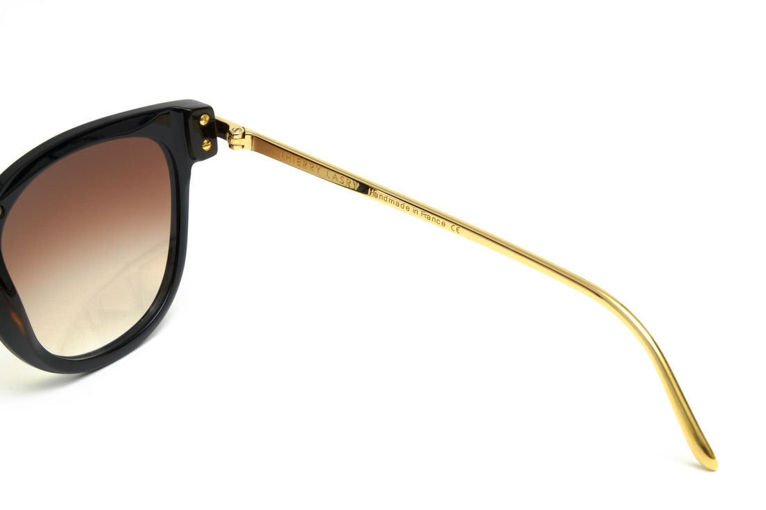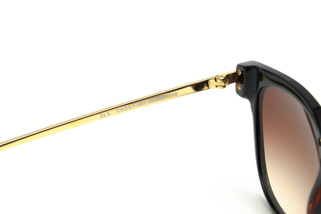 24金の純金をイメージされたブリッジとテンプルが特徴的なウェリントンサングラス。フランスの熟練の職人がハンドメイドで仕立て、素材にはイタリアの老舗メーカーであるマツケリー社のアセテートのみを使用。落ち着いた大人のデザインと知的なイメージがセレブな大人を演出してくれるサングラス。スタイリングにエッジをプラスしてくれます。 |
