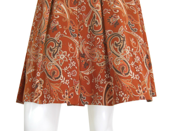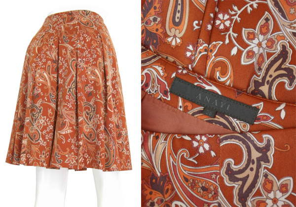 商品詳細 | NO-A3423 ★【ブランド】 *ANAYI ㈱ファーイーストカンパニー 日本製 ★【特徴】 *しっとりとした上質な薄手素材、赤茶色を基調としたペイズリー柄がクラシカルな雰囲気の美揺れプリーツスカートです。 ペイズリー柄の中にお花をデザインし、全体のカラフルな色使いがとても目を惹きます! スカートのフロント・バック部分はボックスプリーツが施されています。 ブラウスなどを合わせて、お食事会やパーティーなどにオススメです。 サイドファスナー、フック留め仕様です。 繊細にデザインされたペイズリー柄が上品なプリーツスカート、是非いかがでしょうか? ・裏地○ ・伸縮性×・ポケット× ・季節性 春夏向け ※状態につきましては当社基準のランク表も合わせてご参考下さい。 | ||||||||||