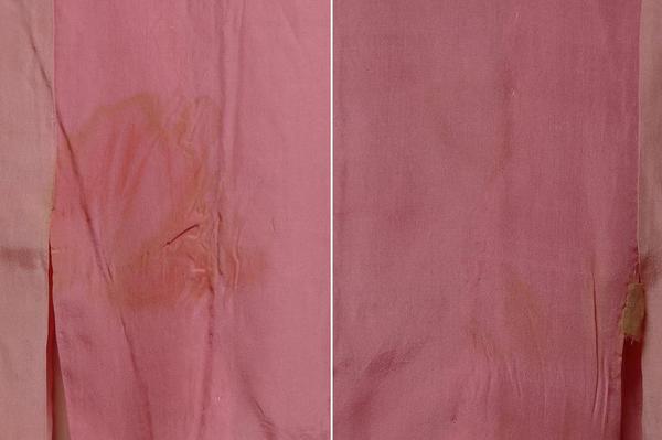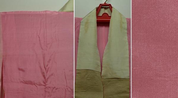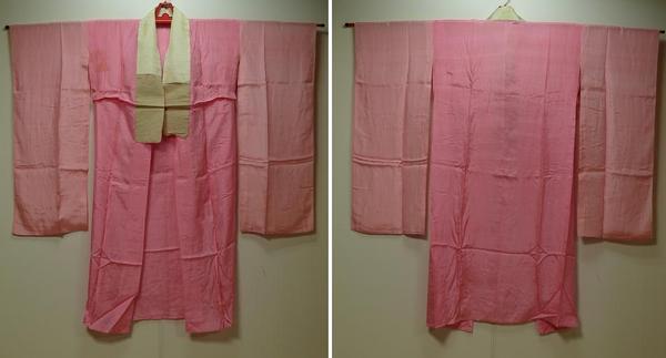 素材:正絹。着丈124cm、裄62cm、袖幅32cm、袖丈87.5cm、前幅32cm(衽含む)、後幅28.5cm。裄約5.5cm伸びます。衿がやけています。右前袖の袖山から約18cmに1.5cmの薄しみが2個と1cmの薄しみがあります。右胸、左胸に写真の様な薄しみがあります。左前身頃の裾から約20cmに5mmのしみがあります。左後ろ袖の袖付け付近に1.5cm、裾に8mmの薄しみがあります。右後ろ肩に1cm×3cmの薄しみが2個あります。
