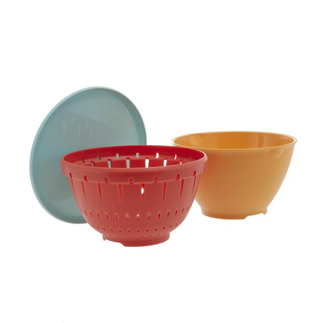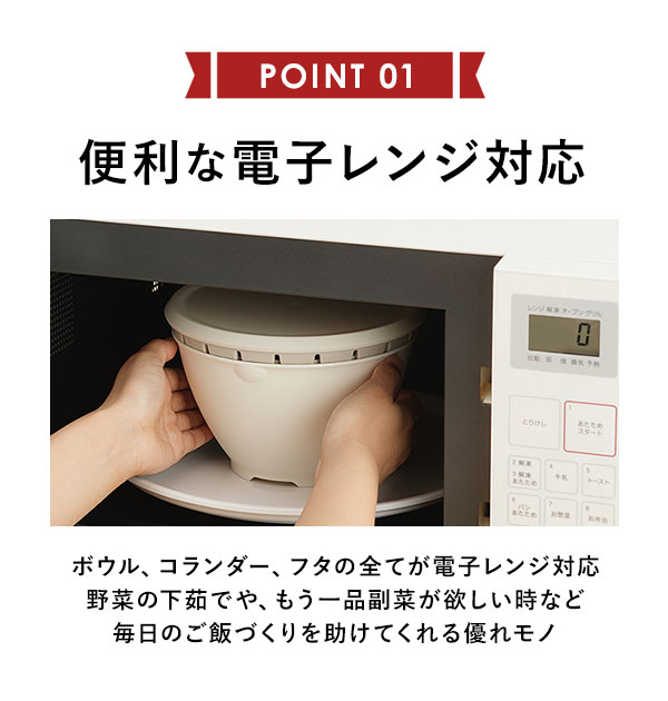 | 商品説明 | ボールとコランダー(水切り用ボール)のセットです。便利なフタ付き。 ボール、コランダー、フタは重ねてコンパクトに収納OK!。可愛らしくきれいなデザインも魅力的です。 ボール、コランダー、フタは電子レンジで使用OK!野菜の下茹でや温野菜など、電子レンジを使った簡単な調理ができます。フタはラップ代わりになって、経済的です。 ボールとコランダーを重ねて使うとコランダーの穴から水が流れ、オーバーフローを防ぎます。切った野菜や茹でた麺などを流水にさらす時などに便利です。 ミキシングしやすい深型ボールです。 |