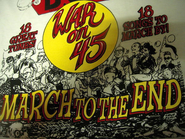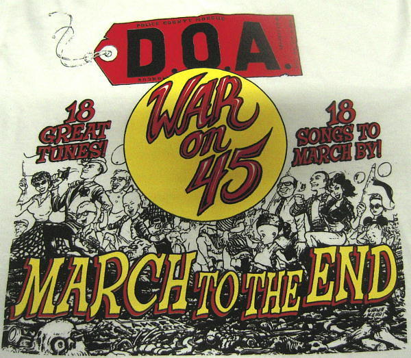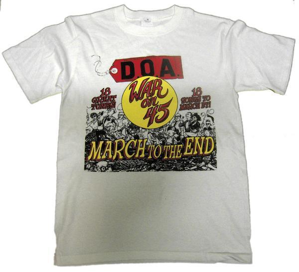 | D.O.A ディーオーエーTシャツ WarOn45 新品・正規品 1978年結成、カナダのベテラン・パンクバンドD.O.AのTシャツです。 82年にALTERNATIVE TENTACLESからリリースされた、DILSのカバーを含むミニアルバム「WAR ON 45 」のデザイン! パンク物には珍しい白ボディーも爽やかです。 Lサイズ 175cm位の方~良いかと思われます。肩幅46cm, 身幅52cm, 着丈75cm 新品・正規品 郵メール便送料¥250(代引き不可・紛失補償なし) ACE CAFE LONDON、LUCKY13、THRASHER、Sailor Jerry等~アメキャラ・企業ロゴ等ライセンスTシャツ、RATFINK関連品、バンドTシャツ、等取り扱っております。 ** 他にも色々出品中です。 CWBT IWTS | |||||||
