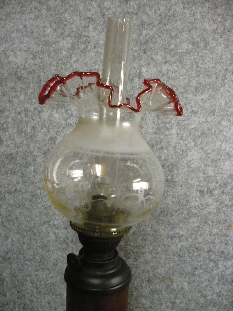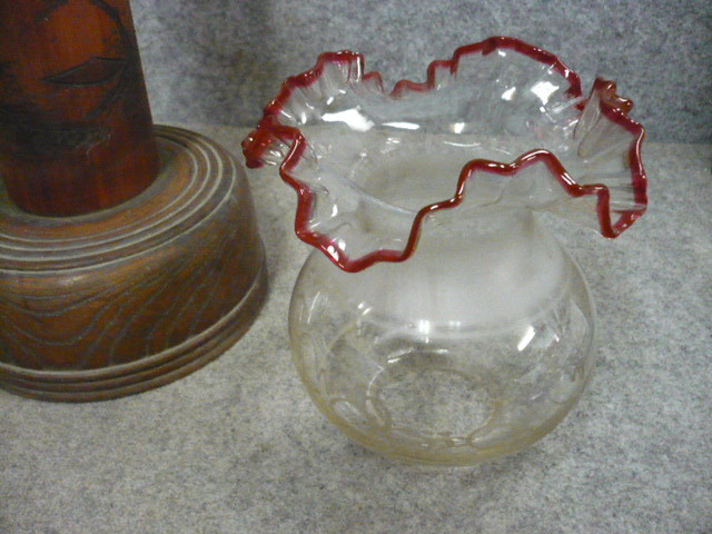【政】30915 アンティーク置きランプ 赤筋ひだホヤ レトロ シェード 明治 大正