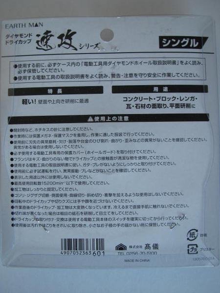 【商品説明】 ダイアモンド ドライカップ シングル新品になります。 壁面や上向き研削に最適!! コンクリート・ブロック・レンガ・瓦・石材面取り・平面研削に! 外径100mm 穴径φ20mm(付属リングφ15mm) 最高使用回転数15.200min-1 本品は新品、未使用品ですが箱等に多少の汚れ細かな傷等がある場合がございますご了承ください。 完璧な商品を求める神経質な方はご入札なされないようお願いいたします。 ノークレーム、ノーリターン、ノーキャンセルでお願いいたします。 上記の記載をご理解の上ご購入のご検討をお願い致します。 【お支払方法】 ゆうちょ銀行、 ジャパンネット銀行 Yahoo簡単決済 【発送について】 沖縄・離島は別途送料がかかりますので、お問い合わせください。 注意事項 当店での出品中の商品は店頭と他サイトとの同時販売の為在庫切れなどの場合もございます、在庫切れの場合納期がかかります入札前に必ずご質問ください。 送料と振込手数料はお客様ご負担になります入金の確認後発送とさせていただきます。送料料金に関しましては梱包手数料梱包費が含まれております。 商品説明にもございますよう、多少の汚れ等ございます。完璧な商品を求める方は、入札をお控ください。 お客様都合による返品・交換は一切受け付けておりませんので、必ず詳しい程度をご確認の上ご入札下さい。気になることがございましたらご遠慮なく質問して下さい。 撮影時の状況及びお客様のPC環境等の諸事情により実際の色目と違って見える場合がございますのでご理解のうえご入札お願い致します。 在庫切れ等の場合出来る限り早急発送を心掛けておりますが、出荷まで数日かかる場合がありますので、お急ぎのお客様は在庫等お問合せ下さい 配送に補償がついておりません補償発送をご希望の方は申し出ください。ノークレーム、ノーリターンノーキャンセルでお願い致します。 土、日曜日、祝祭日、はネット業務はお休みのため、商品の発送及びご連絡等、質問への解答 が休日あけに遅なる場合がございますがご了承ください。 管理番号ダイアモンド ドライカップ シングル |