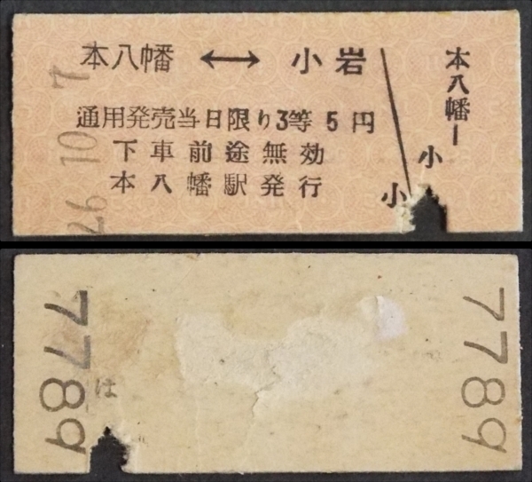 297☆硬券乗車券・本八幡⇔小岩・3等5円・昭和26.10.7・☆