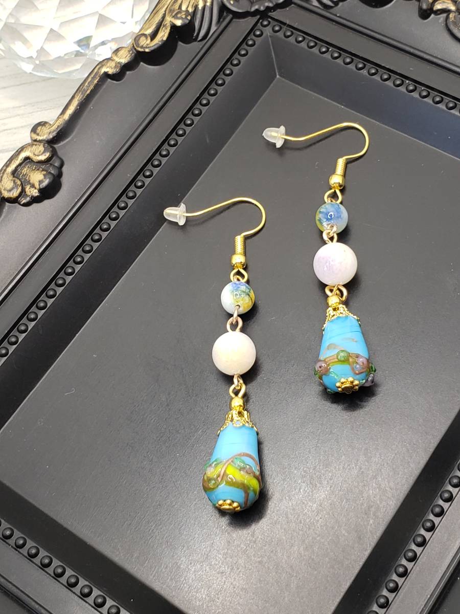 ★ハンドメイド イヤリングorピアス A957 樹脂フック・バネ(クリップ)式イヤリング金具など変更無料 ジェイド 絵付  ガラス★