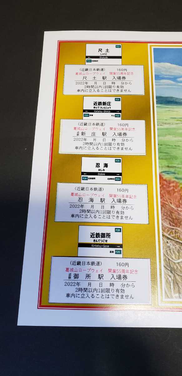 | ♪商品説明♪ | 昭和42年3月26日の開業より55周年を迎えた葛城山ロープウェイへと続く、御所線 尺土駅・近鉄新庄駅・忍海駅・近鉄御所駅の硬券入場券を4枚セットと、工事中や開業セレモニー、葛城山の季節の風景が楽しめる写真を使用した台紙のセットでの出品となります。 ※記念入場券はクリアファイルに梱包し、商品発送させていただきます。 |