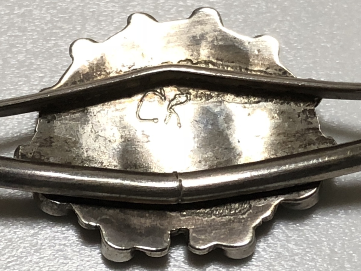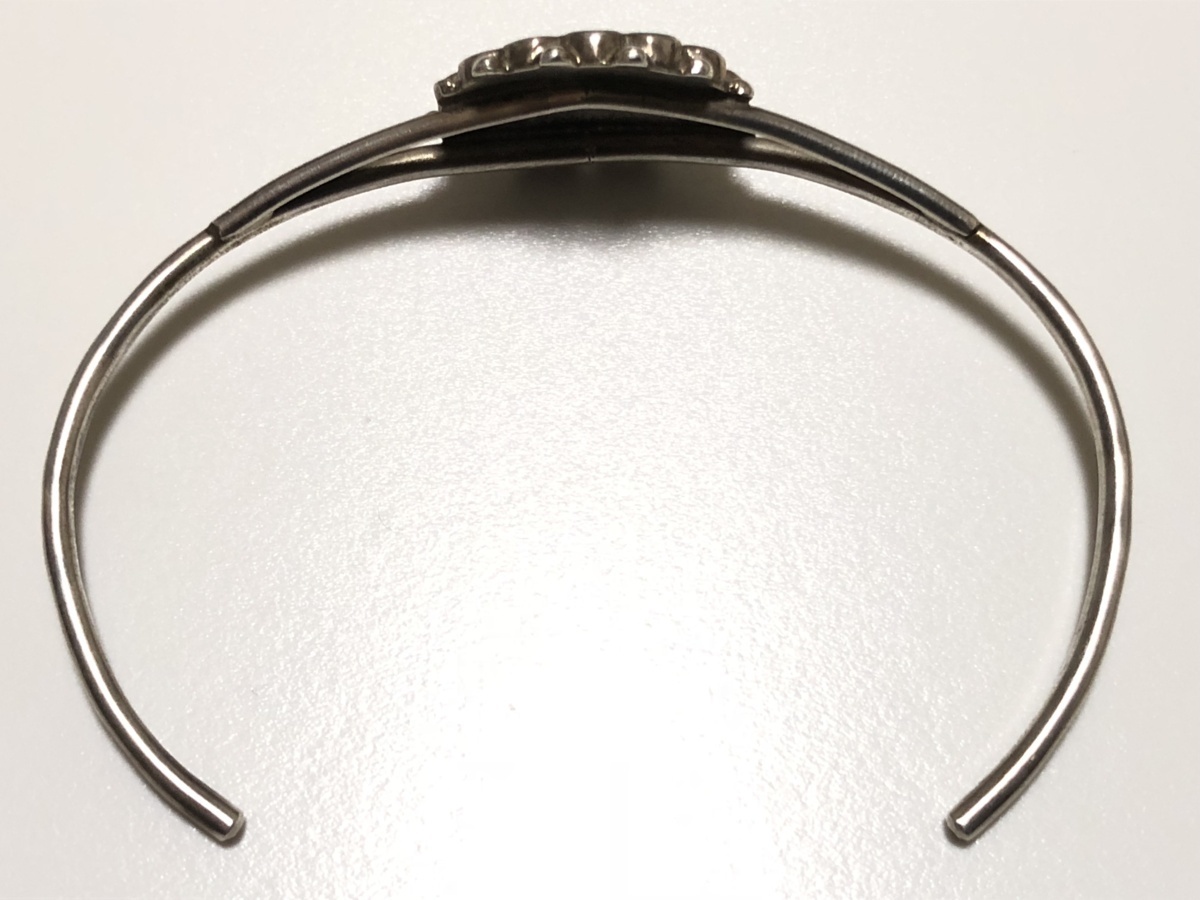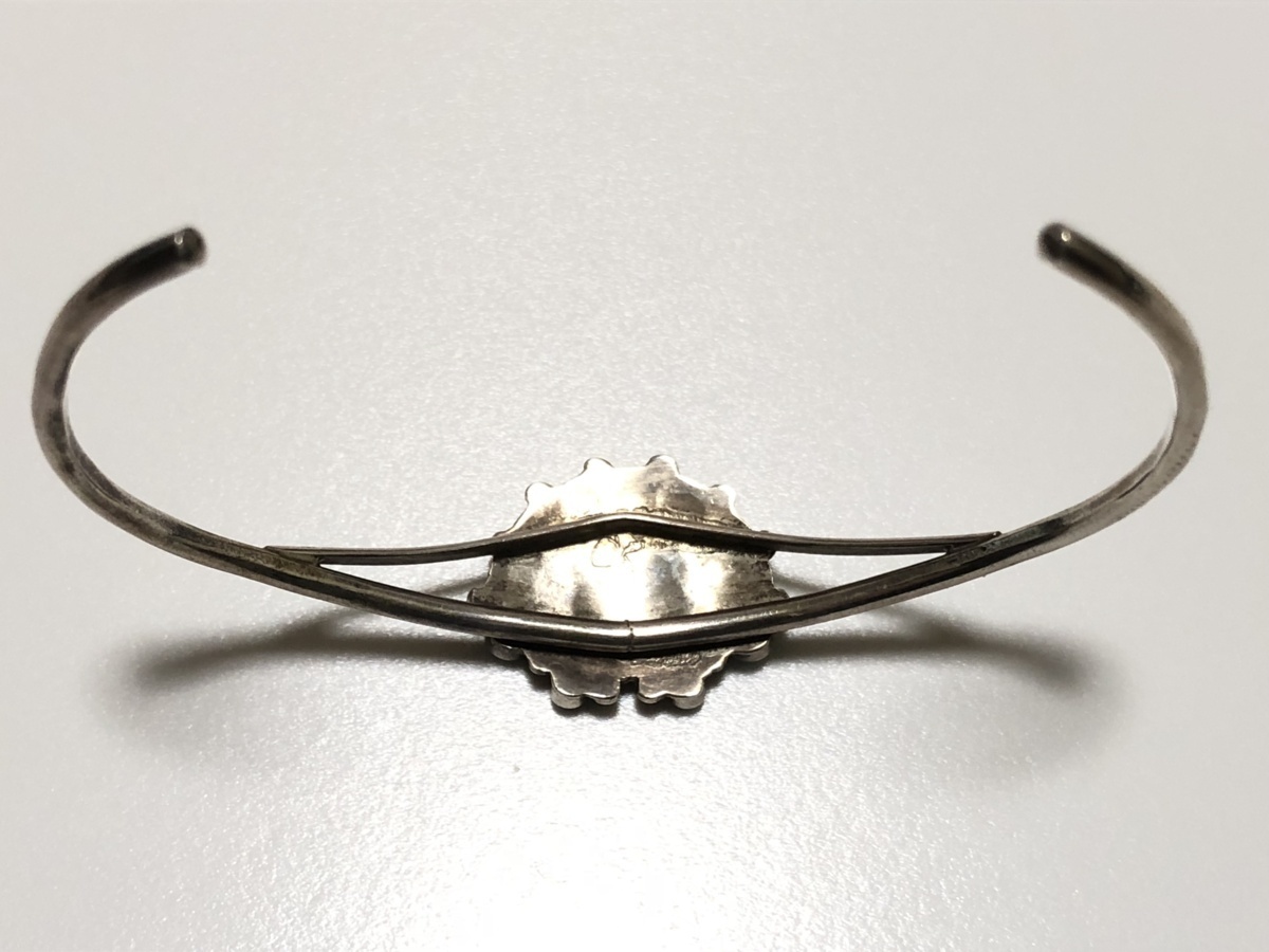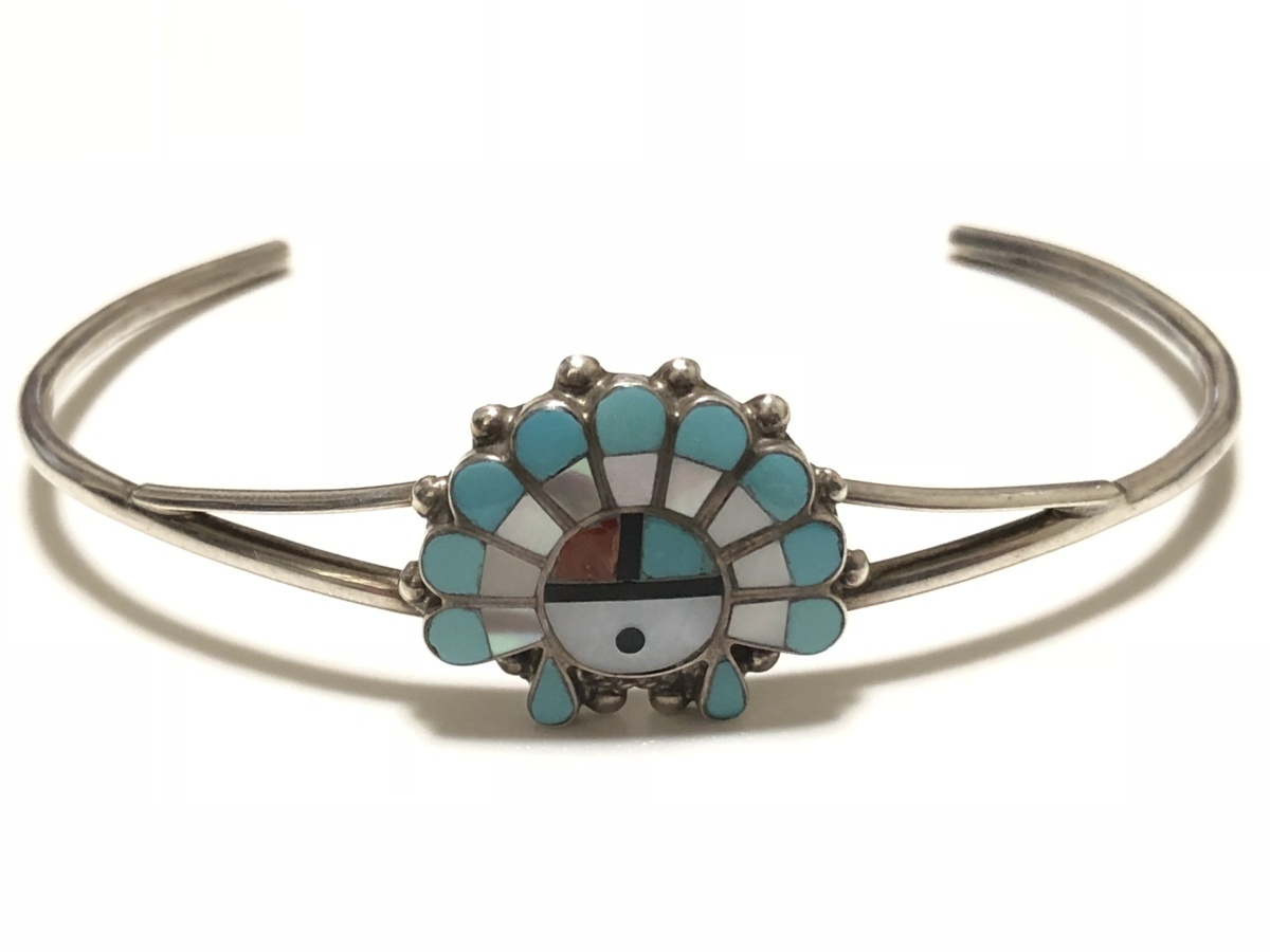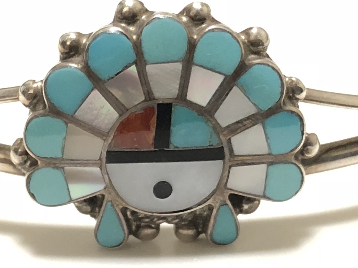 インディアンジュエリーのターコイズ、シェル、レッドコーラル、オニキス、Sterling Silverを使用し、インレイを施した、サンフェイスデザインのバングルです。作者、CRの刻印があります。金属面はSterling Silver使用ですが、刻印はありません。
