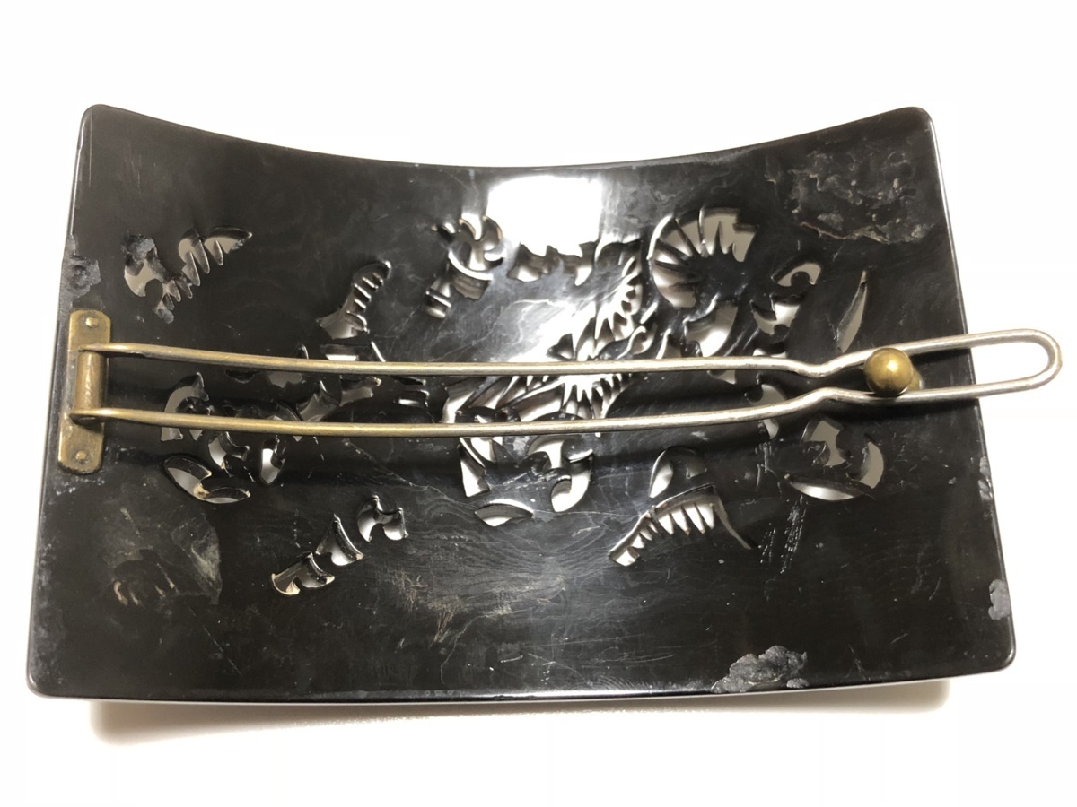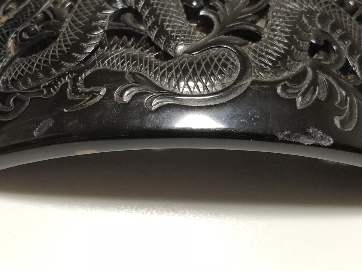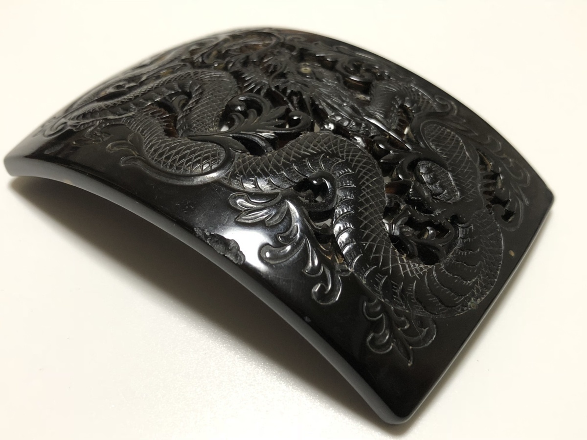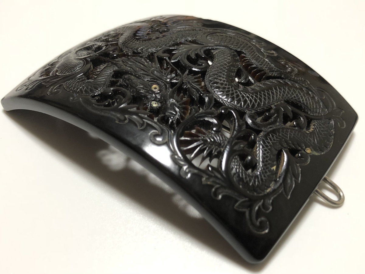 アンティークの黒甲の本鼈甲を使用した、細密透かし龍細工のバレッタです。数か所の虫食いがある為【難あり】表示です。 縦5.7㎝、横8.8㎝、重さ26.9g