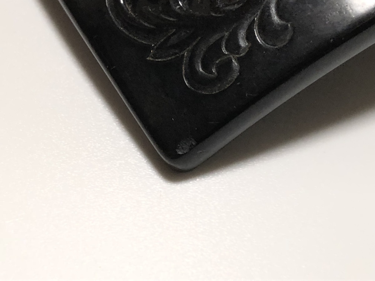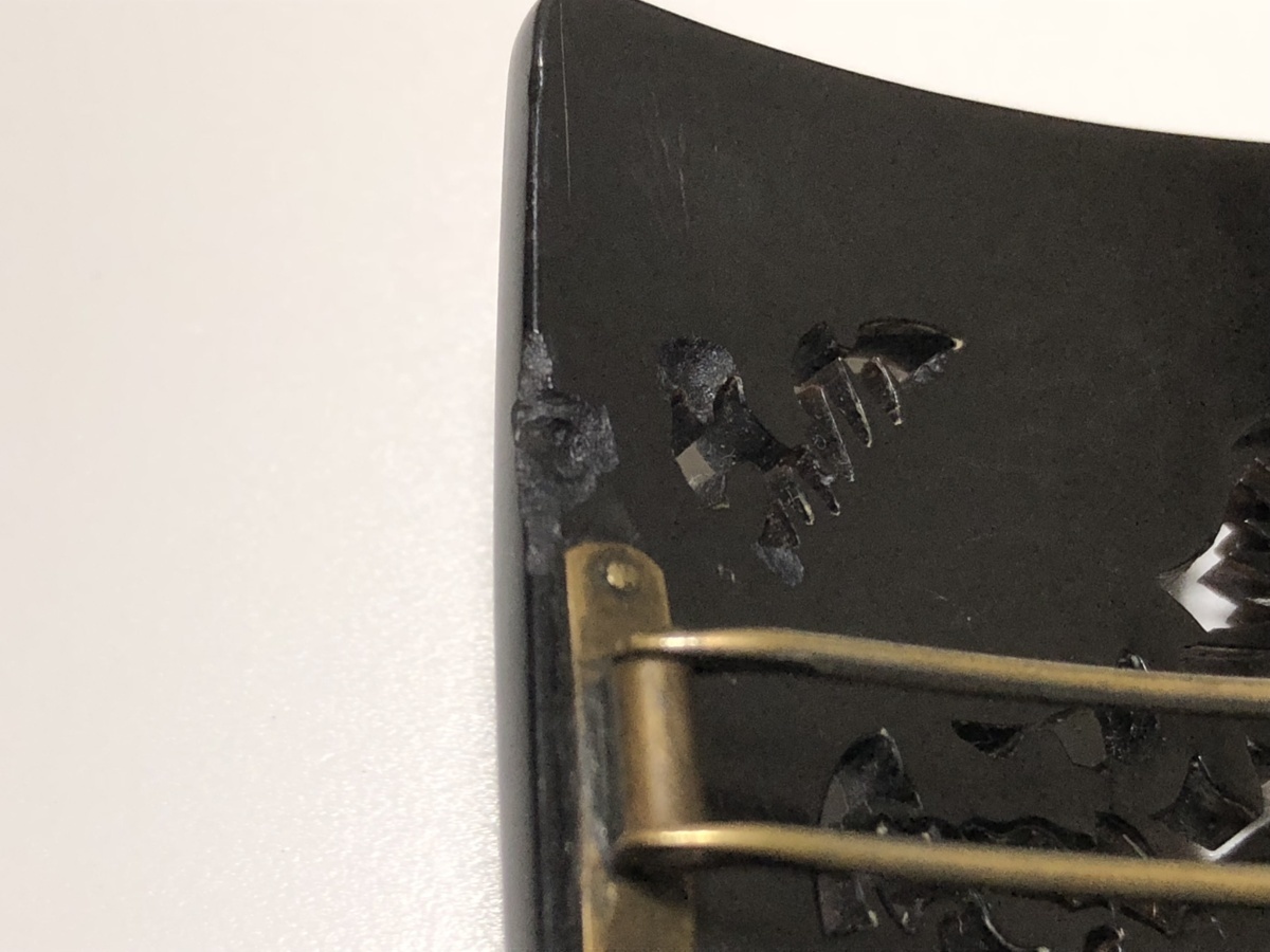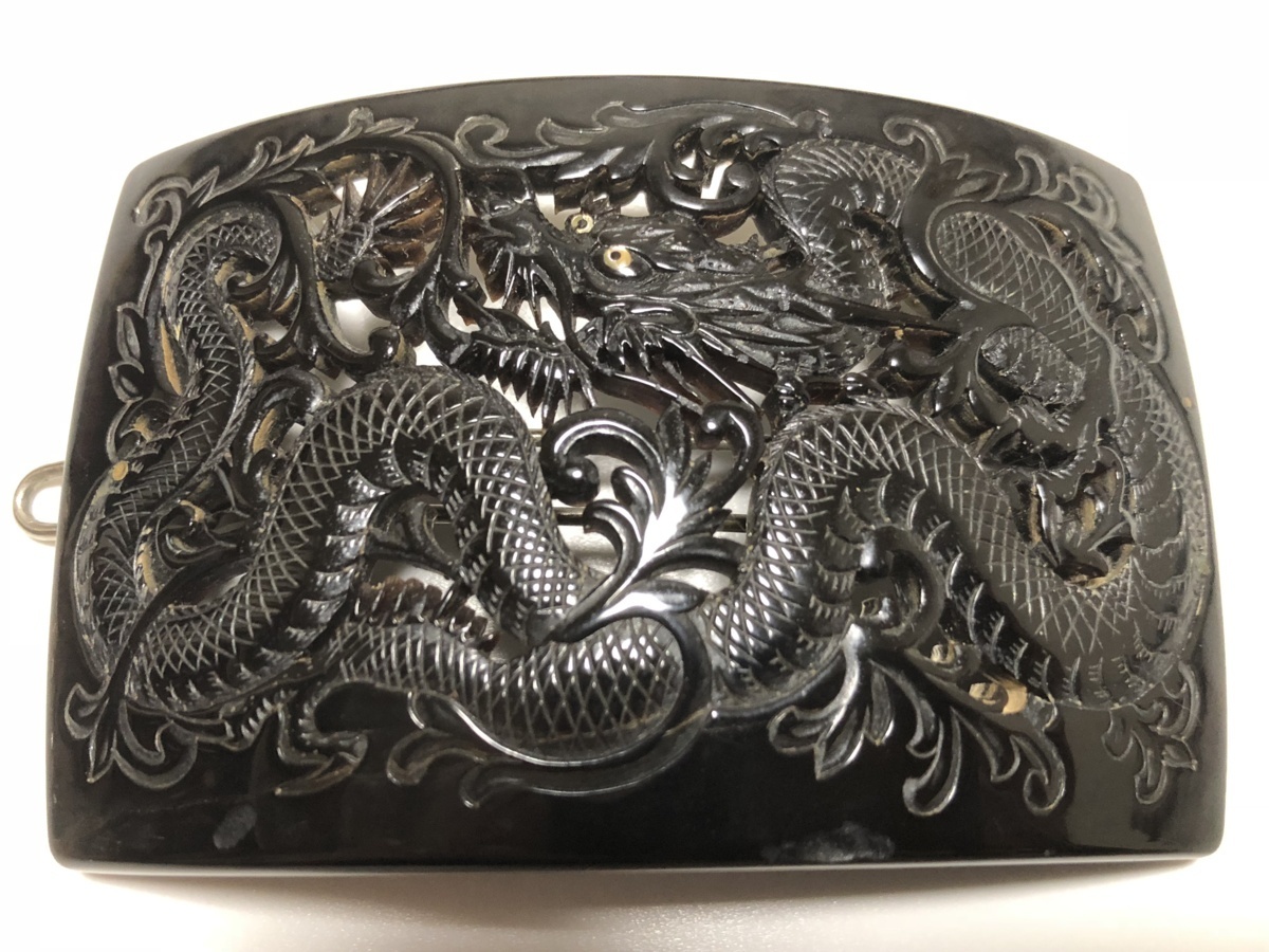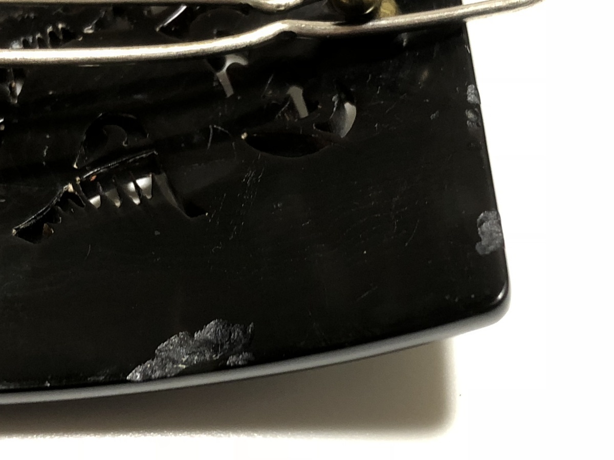 アンティークの黒甲の本鼈甲を使用した、細密透かし龍細工のバレッタです。数か所の虫食いがある為【難あり】表示です。 縦5.7㎝、横8.8㎝、重さ26.9g