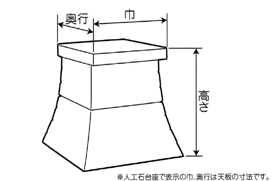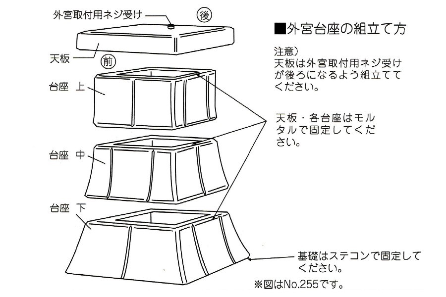 お支払方法に代引きはお選びいただけません。 外宮・祠をしっかり支えるコンクリート製の台座です。 格子に組み上げた、石台風の仕上げでありながら価格を抑えた質の良い製品です。 各部分のサイズをよくご確認の上、お求めください。 こちらの商品が適応する外宮はこちらです。 ・八幡宮造り 8寸 ・祠宮造り 1尺 ・千鳥屋根造り(けやき) 1尺 ・銅葺き流れ造り 1尺 ・銅葺き流れ造り(けやき) 1尺 ・銅葺き板宮造り 1尺 ・二社宮造り | ||||