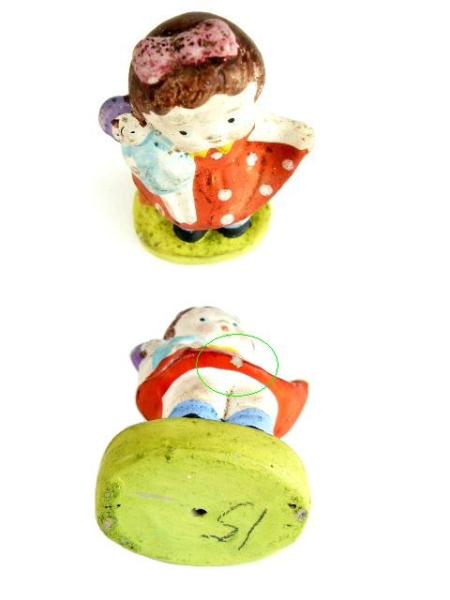 | 商品紹介 | 昭和30年代頃のものではないかと思われます。 (写真は解り易いように複数の角度から写しています。1点の出品です。) 写真でご覧のように所々にヨゴレ、欠け、塗料の剥落があります。(写真参照) 大きなものとしてスカート前部に若干の欠けがあります。 (写真1・3枚目同位置〇印参照) 人形の顔などにヨゴレがあります。 底に製造工程上のホールがあります。 数字の書き込み、塗料の剥落などがあります。(写真3枚目参照) リボンの点状のものはラメが変色したものと思われます。 中古品ですので経年の色褪せ、ヨゴレ、小キズ、欠け、塗料の落ちなどがあります。 他に大きなダメージはないと思われますが 見落とし、書き落としもあろうかと思いますので 状態、欠品などは画像にてご判断下さい。 写真のものが全てです。 写真でご判断下さる様お願い申し上げます。 落札時に出品者からのメッセージが届きますのでご覧下さい。 (マイオークションの通知設定を非通知にしている場合は届きません) メールが届かない場合はお手数ですがご連絡下さい。 落札後のキャンセルはお受けできません |