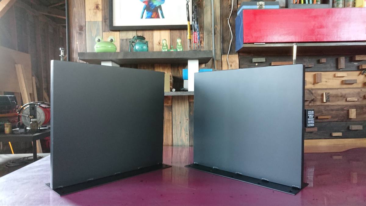 ハンドメイドの鉄脚2脚1組での出品です。6×16mmの極細フラットバーを使用しその上に1.6mm厚の鉄板を溶接しております。とてもスマートでスタイリッシュでありそうでなかったデザインだと思います♪