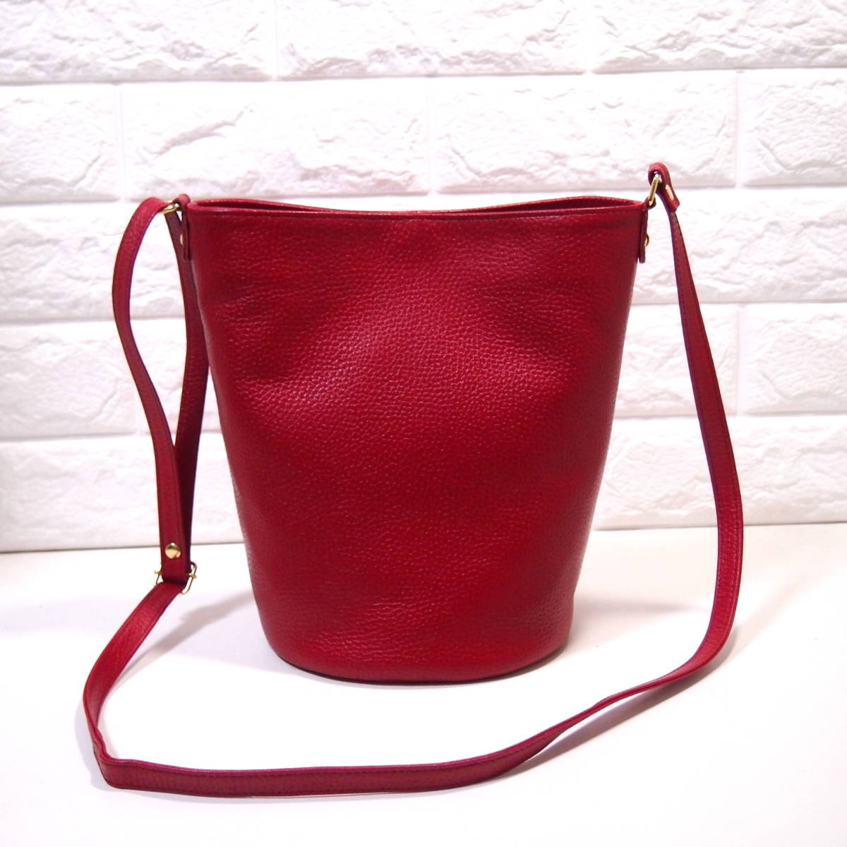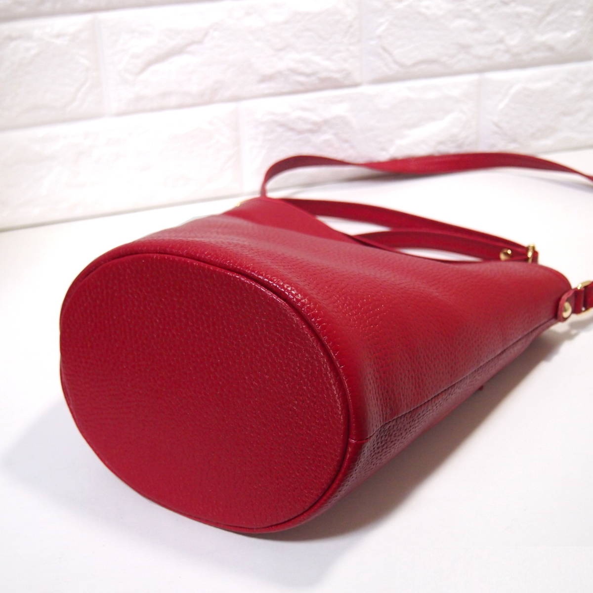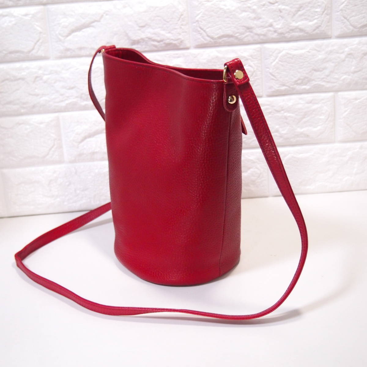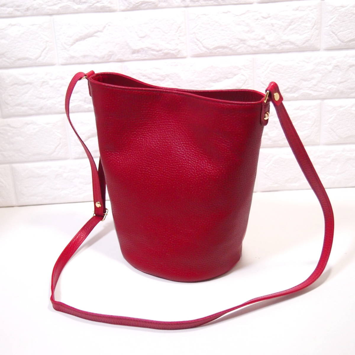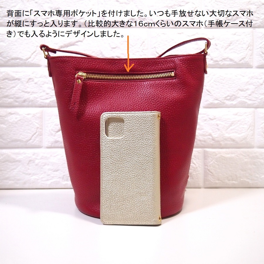 ★ハンドメイド★日本製★ソフト・牛革★底円形・バケツ型★斜め掛け(肩掛け)ショルダーバッグ★スマホ専用ポケット★アカ色★