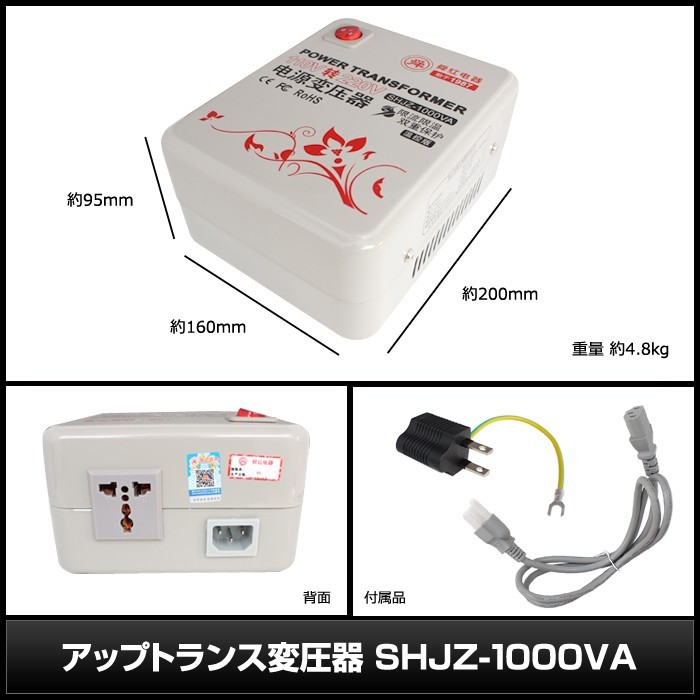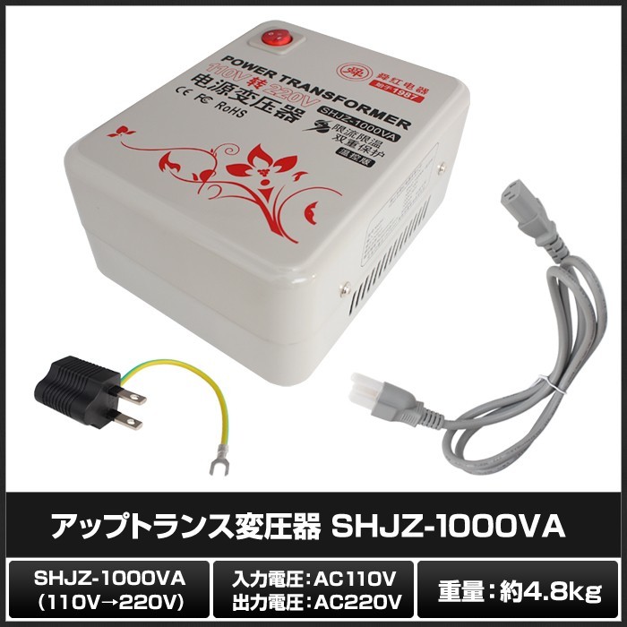 商品:アップトランス変圧器 型番:SHJZ-1000VA-110V 重量:約4.8kg 入力電圧:AC110V 出力電圧:AC220V | |