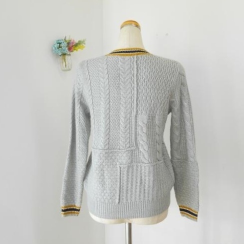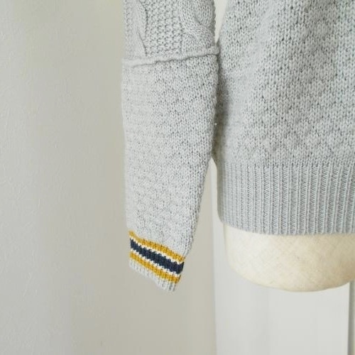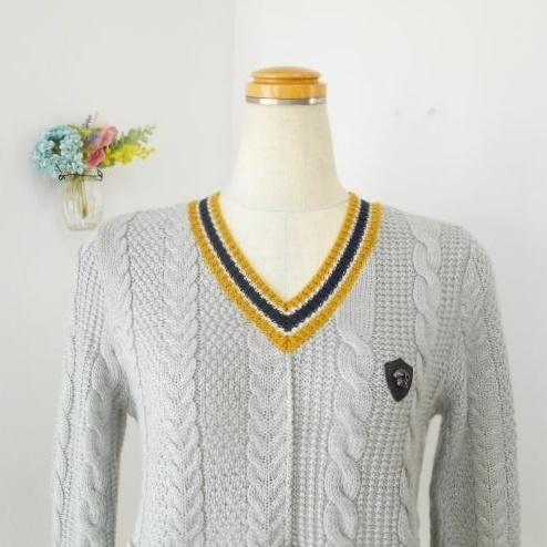ディーゼル DIESEL 秋冬に着て頂けそうなVネックニットセーターです。ウール混で暖かそうです。お色はグレーに、縁取りのレンガ×紺・ネイビーのボーダーがアクセント。胸にスカルが付いています。色んなボトムに合わせてどうぞ。