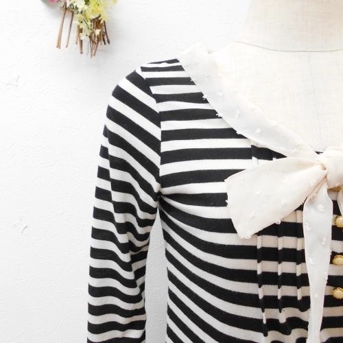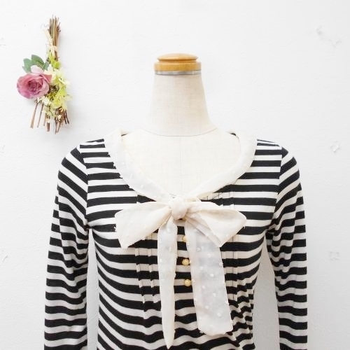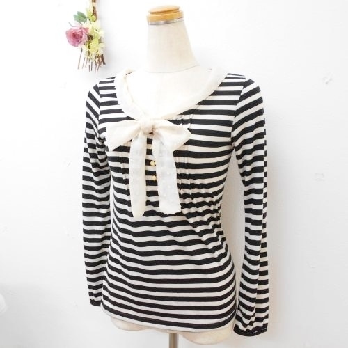 アロー ARROW レディース 春秋などに着て頂けそうな長袖Tシャツ・ブラウスです。お衿が別生地で薄いベージュ、白×黒のボーダー柄が素敵なトップスです。