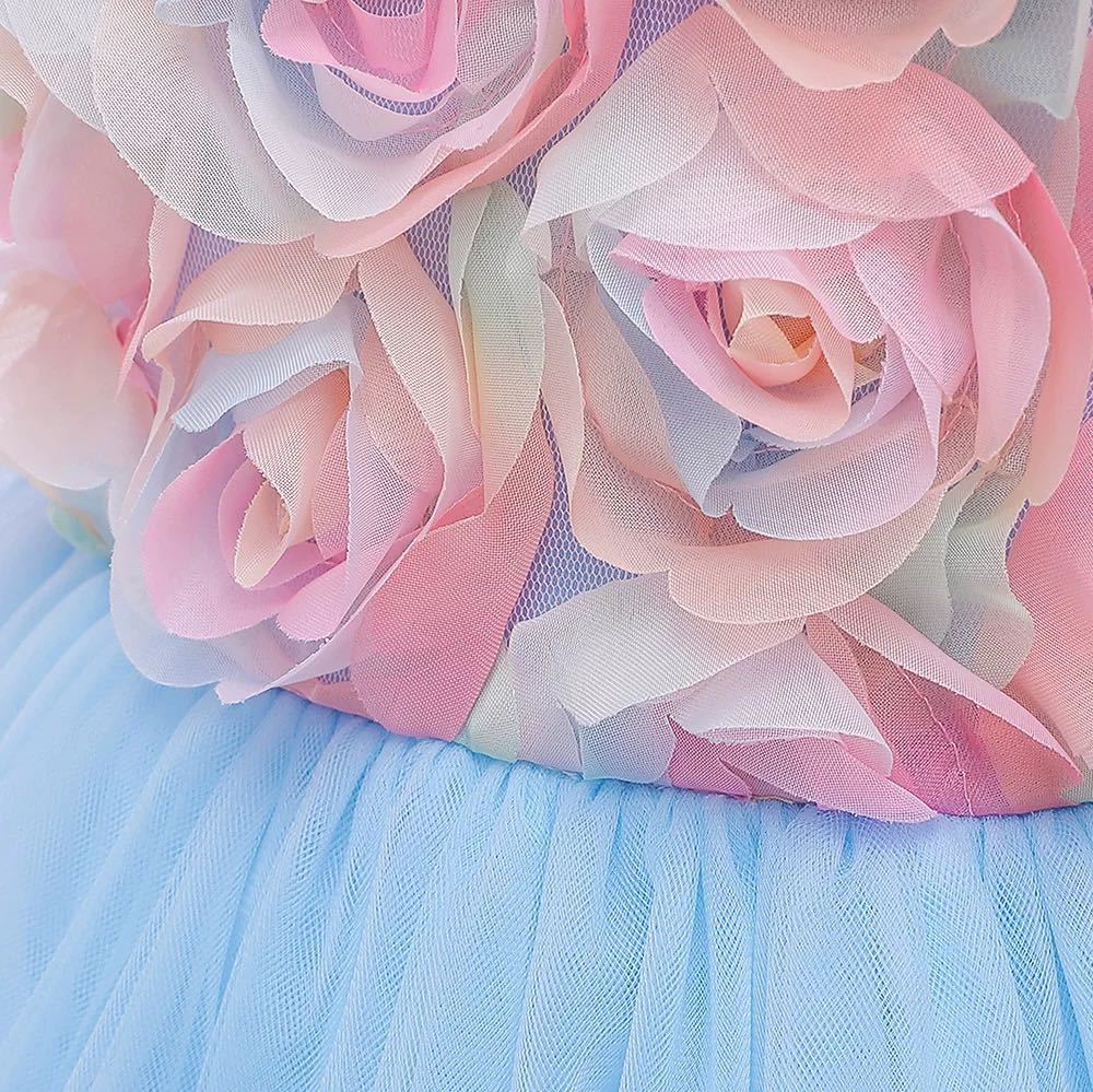 膝上の丈になります。上身の花びらが鮮やかで可愛い、ドレス下部分はふんわりです。